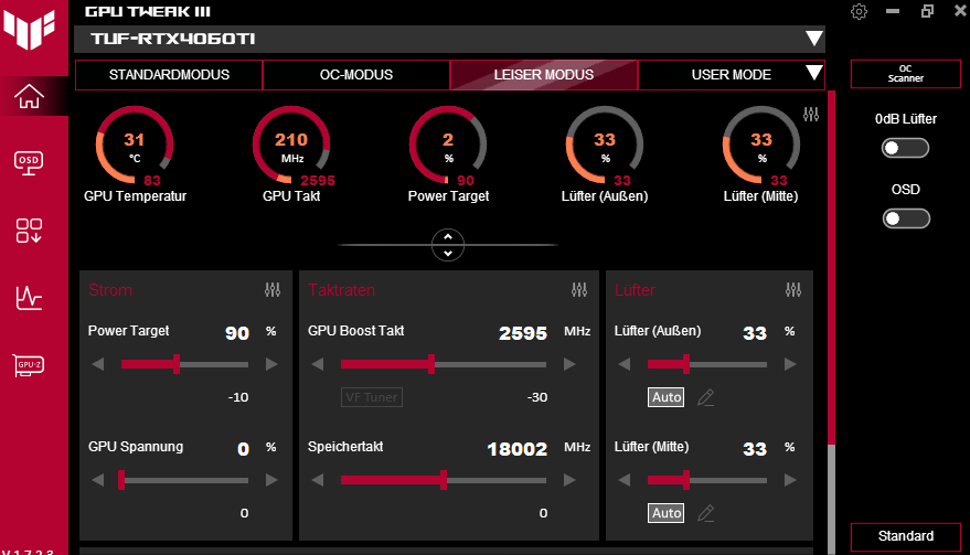 Asus GPU Tweak 3 (Version v1.7.2.3) reguliert die Lüftersteuerung der Grafikkarte nicht ordnungsgemäß. Also im Leerlauf läuft die GraKa mit 24Grad (Minus, Plus). (Vom Zocken red ich mal nicht, da kommt es gern auch bei leistungsschwachen Spielen dann auf 50Grad.)