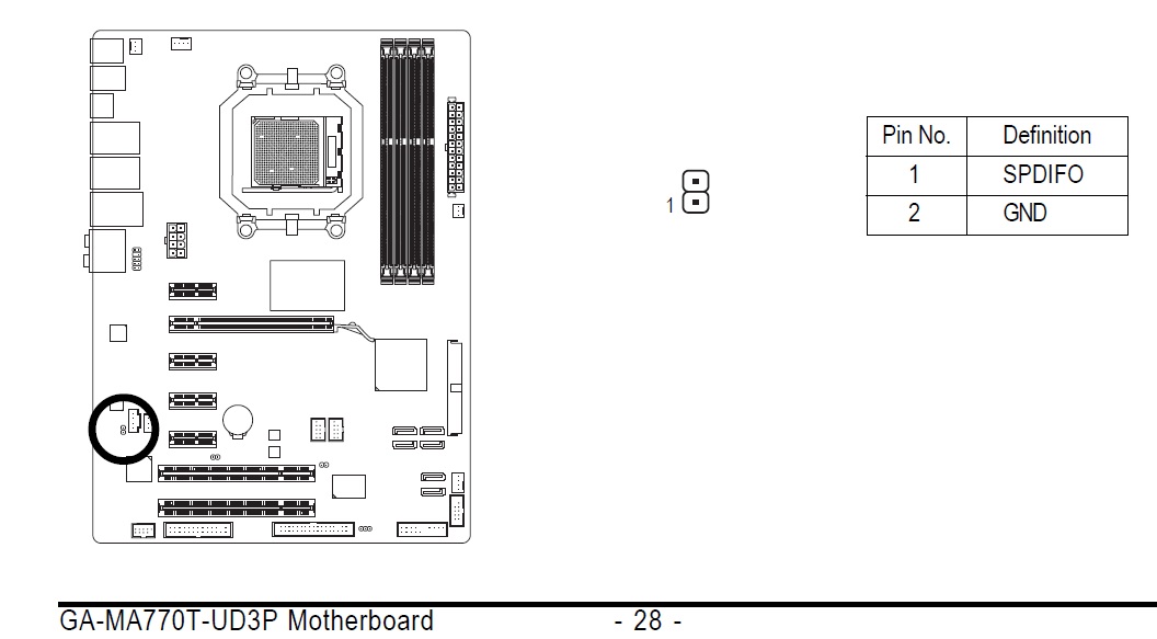 Nun steht ja in der Beschreibung, dass man das SPDIF Kabel mit dem Mainboard (Gigabyte MA770T-UD3P) verbinden soll. Auf dem Mainboard befinden sich 2 Pins. Wobei laut beiliegender Beschreibung der obere der SPDIFO ist und der untere der GND. Laut Beschreibung im Interent (offizielle Seite von Gigabyte) ist es genau umgekehrt.