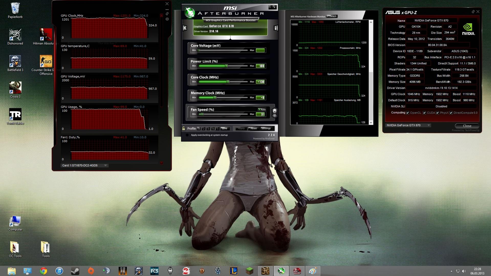 ich habe jetzt eine Asus Direct Cu II GTX 670 4 GB und wollte sie mit dem GPU Tool von Asus selber, etwas übertakten. Mit dem Core Speed @ Stock also 980 Mhz mit Boost im Idle und beim Unigine Heaven Benchmark 4.0 mit 1084 Mhz bei Belastung kam ich auf 814 Pkt bei Max Tesse / 8x AA / Ultra.