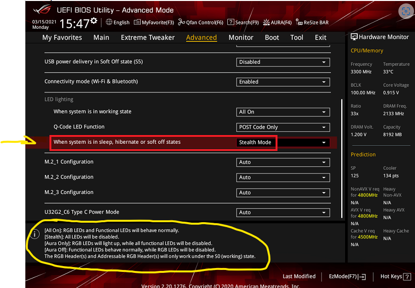 Gibt es eine Möglichkeit die (Hardwarebeleuchtung) bei meinem Asus Motherboard und Grafikkarte dauerhaft im BIOS zu ändern? Unter Windows ist das mit OpenRGB kein Problem aber schalte ich den Rechner ab und starte später neu ist alles wieder im Regenbogenmodus sprich die im jeweiligen BIOS gespeicherte Hardwarebeleuchtung. Ich installiere auf keinen Fall Asus Amoury Crate denn das ist die schlimmste Bloatware die mir in den letzten Jahren untergekommen ist. Ich möchte auch nicht das OpenRGB im Hintergrund läuft da die gewünschte Farbeinstellung ohnehin nur nach dem vollständigen booten von Windows die hinterlegten Einstellungen lädt.