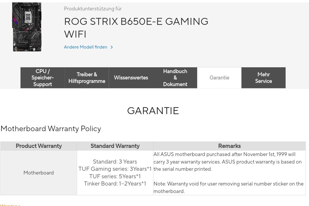 Beim der Registrierung, um die vollen 36 Monate zu erhalten, wird jedoch bei ASUS festgestellt, dass dieses Board 0 Monate Garantie hat und außerhalb der Garantiezeit ist. Nun konnte ich dies durch Nachweis des Kaufbelegs jedoch anpassen lassen indem man diesen auf ASUS hochlädt. Ergebnis inkl. Anruf von ASUS, es gibt keine Garantie nach der Gewährleistung von 24 Monaten, die 12 Monate danach wollen die nicht geben, weil das Board nach Überprüfung aus Italien stammt (Seriennummer)