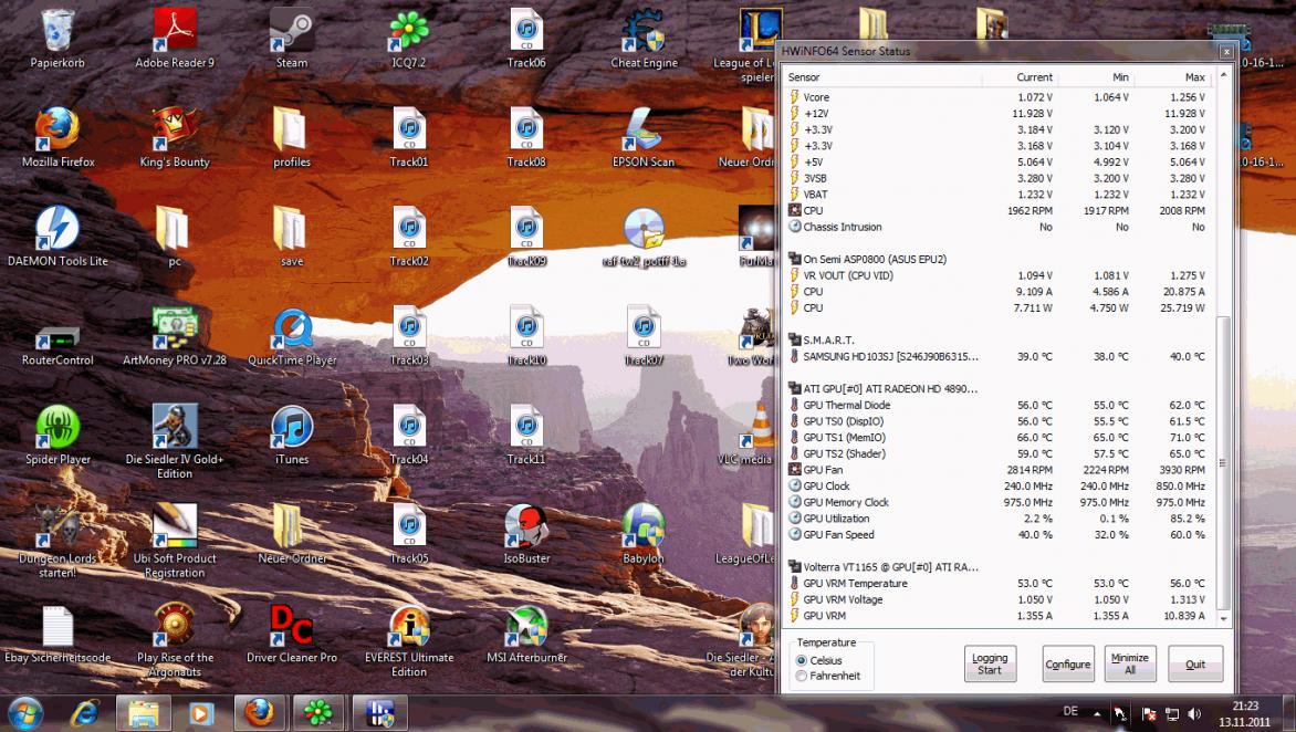Wenn ich auwendigere Spiele spiele, wie beispielsweise Skyrim oder Two Worlds 2 dreht der Grafikkartenlüfter unter extremer Lautstärke, sehr hoch. Danach, ca. nach 1-5 min bekomme ich einen bildschirm auf dem nur noch bunte pixel zusehen sind und mein PC rebootet danach. Zudem hatte ich teilweise auch einen Bluescreen mit der Fehlermeldung atikmdag.sys. Nachdem ich jetzt den neusten Treiber installiert habe bekomme ich zwar keinen Bluescreens mehr, habe aber immernoch das Problem des bunten Pixelbildschirms.