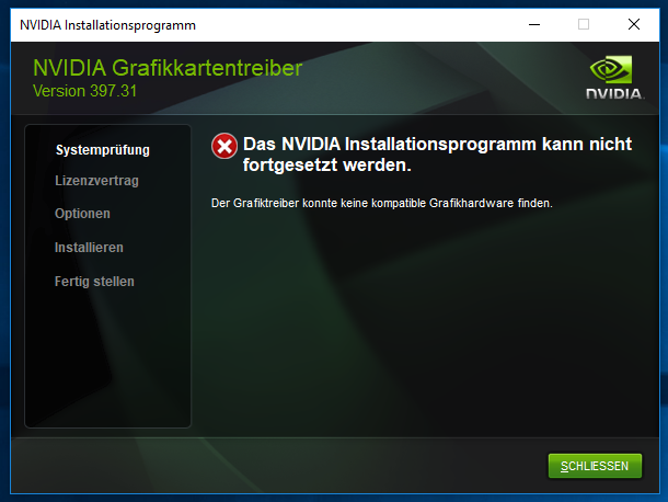 Habe es komplett zurückgesetzt und wollte nun den veralteten nVidia Treiber aktualisieren. Diesen habe ich mir heruntergeladen und das Setup gestartet. Hier gibt es nun aber das Problem, dass er angeblich keine kompatible Garfikkarte findet.