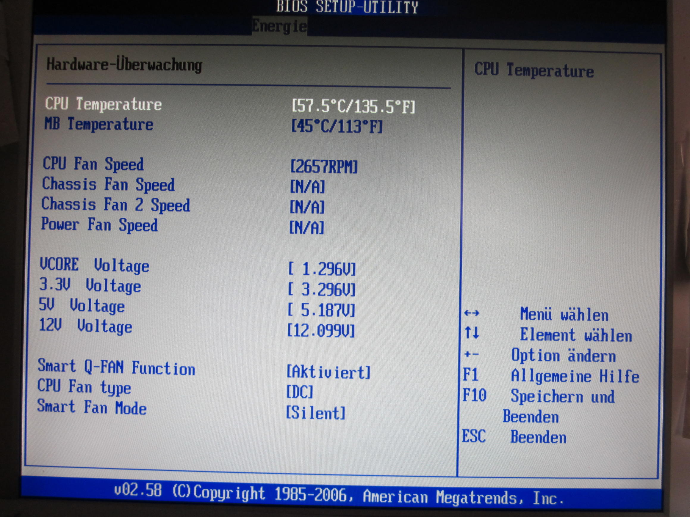 nach Installation eines DVD-Laufwerks hatte ich Bios-Probleme (angeblich Overclocking). Jetzt lauft alles wieder, allerdings funktioniert Cool and Quiet nicht mehr. An Mainboard, CPU, Speicher bzw. XP wurde nichts verändert. Vorher war der Lüfter nach PowerOn aus und hat sich dann vom Bios gesteuert schon vor dem Starten von XP auf mittlere Drehzahl eingeregelt. So blieb er dauerhaft, außer die CPU lief unter Volllast. Jetzt läuft er vom ersten Moment mit maximaler Drehzahl. Energieoptionen sind auf MinimalerEnergieverbrauch eingestellt. Jetzt habe ich alle mir logisch erscheinenden Einstellungen ohne Erfolg probiert. Auffällig ist, das nach jeder Veränderung zwei XP-Starts erforderlich sind. Beim ersten Mal ist die Tastatur nicht aktiv. CPU läuft mit 1350 bzw 2700 MHz, AiOverclocking im Bios war und ist mit AUTO angegeben. Was kann ich tun?