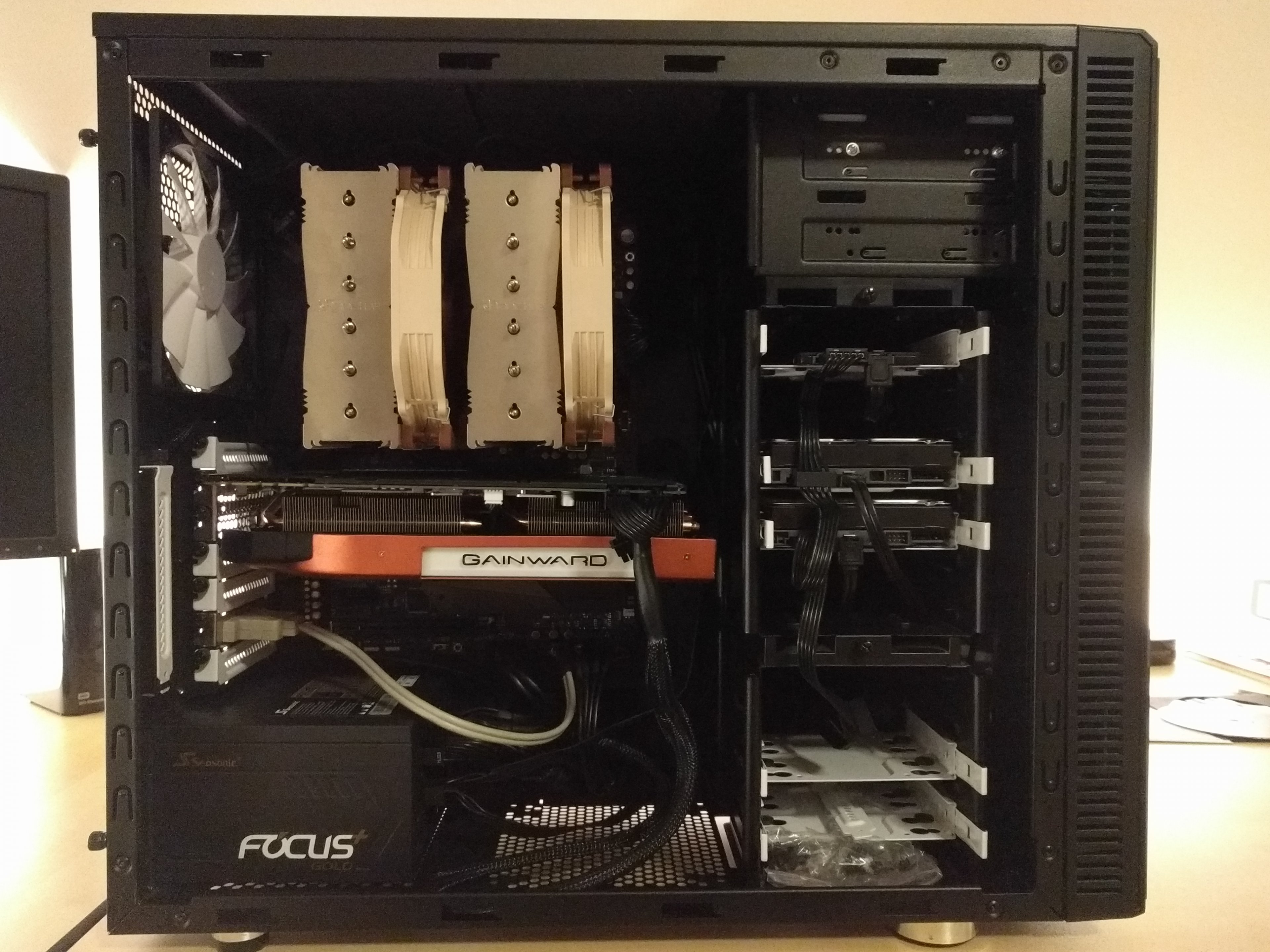 Da ich beide Lüfter verwende möchte, bleibt mir nur die Option den Luftstrom von unten nach oben aus dem Gehäuse zu leiten. Somit verdecke ich allerdings den PCIEX16_1 und muss für die Grafikkarte den _2 verwenden. Beim XI sind das ja beides, inkl. dem _3 X16 PCIE Slots.