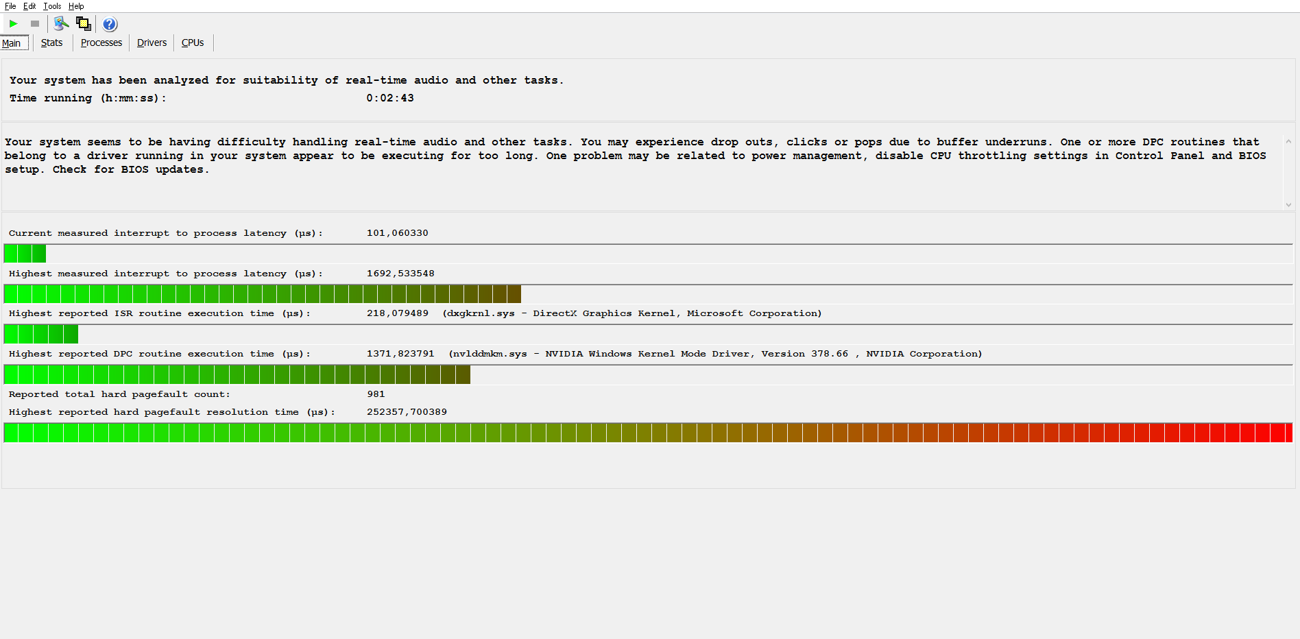 NOTE: some processes were hit by hard pagefaults. If these were programs producing audio, they are likely to interrupt the audio stream resulting in dropouts, clicks and pops. Check the Processes tab to see which programs were hit.