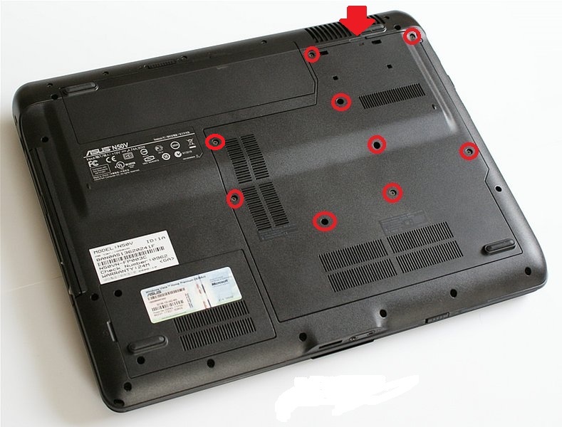 So, anbei ein 2 detailierte Bilder von deinem Notebook. Bild 1 zeigt die Unterseite, die Schrauben in den Kreisen einfach entfernen und dann mit dem Fingernagen dort die Klappe anheben, wo der Rote Pfeil hinzeigt.