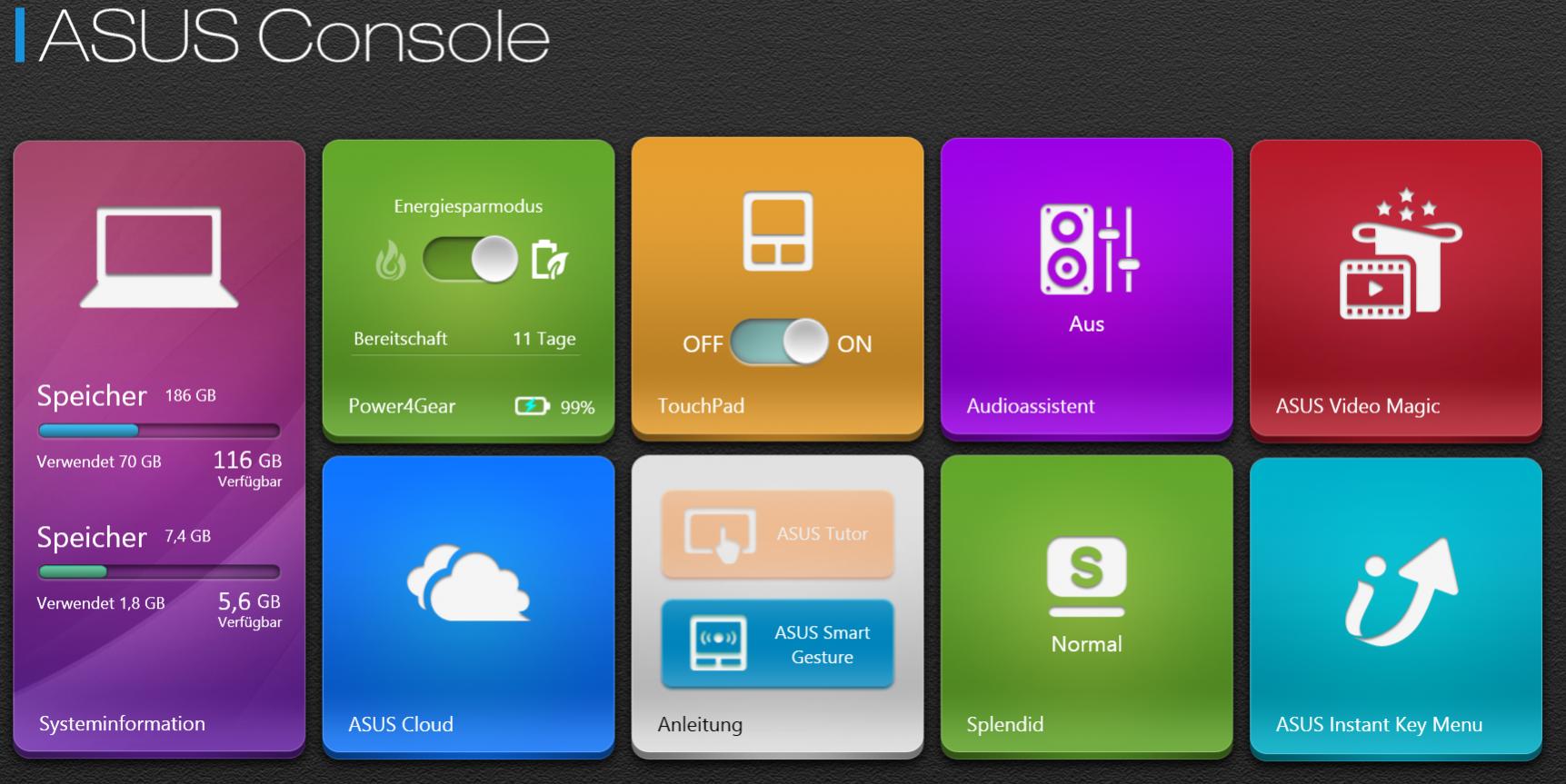 ASUS Console – ein Vollbildprogramm mit diversen Einstellungen, seht einfach selbst: