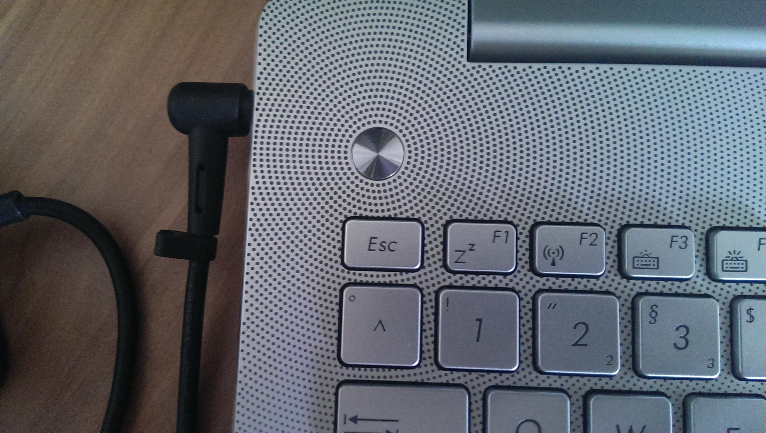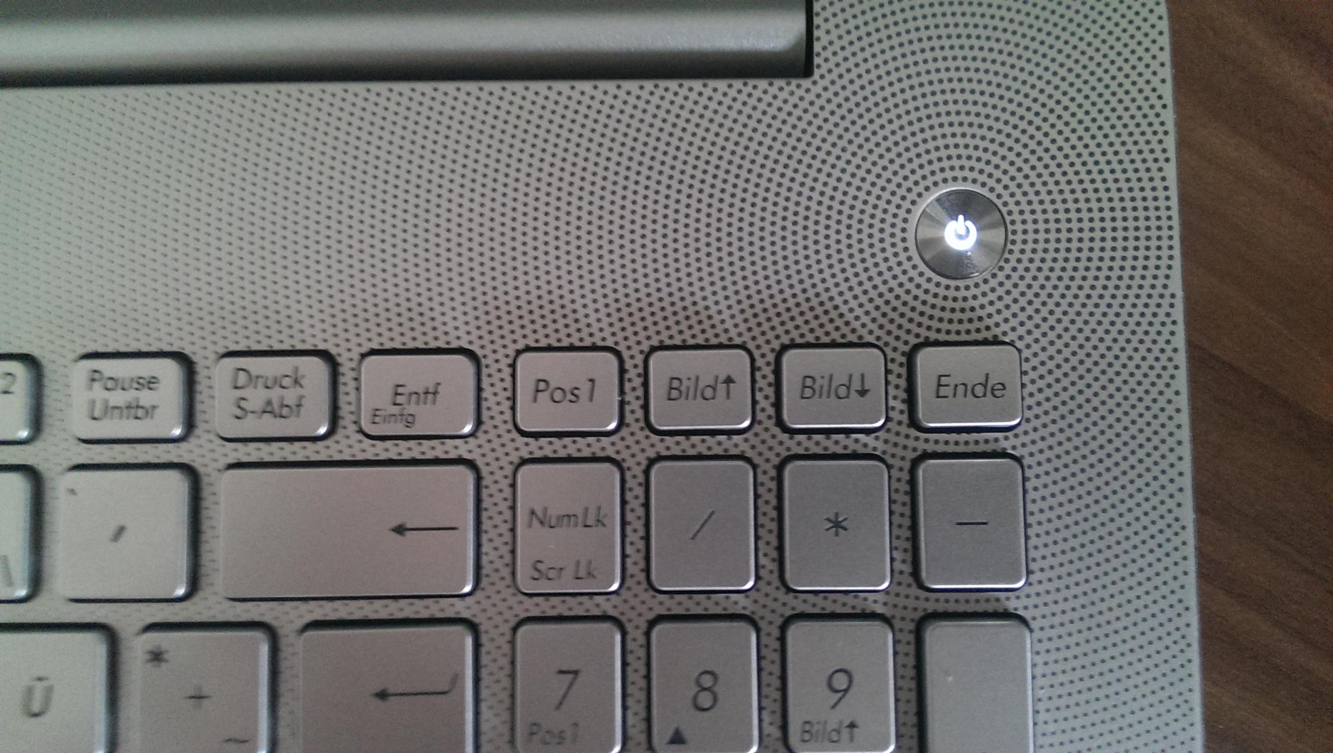 Der Powerknopf befindet sich über dem rechten Ende der Tastatur und leuchtet wenn das Gerät in Betrieb ist.