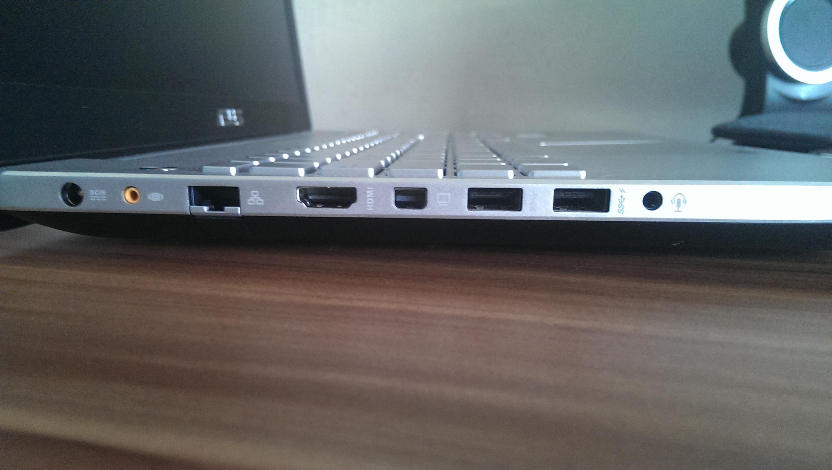 Auf der linken Seite befindet sich der Anschluss für das Netzteil, der Anschluss für den Subwoofer, der Ethernetport, die HDMI und Mini-Displayport Anschlüsse, zwei weitere USB 3 Buchsen, wovon der rechte der mit der Ladefunktion ist und zuguterletzt auch eine 3,5mm Klinke Audio In/Out Buchse.