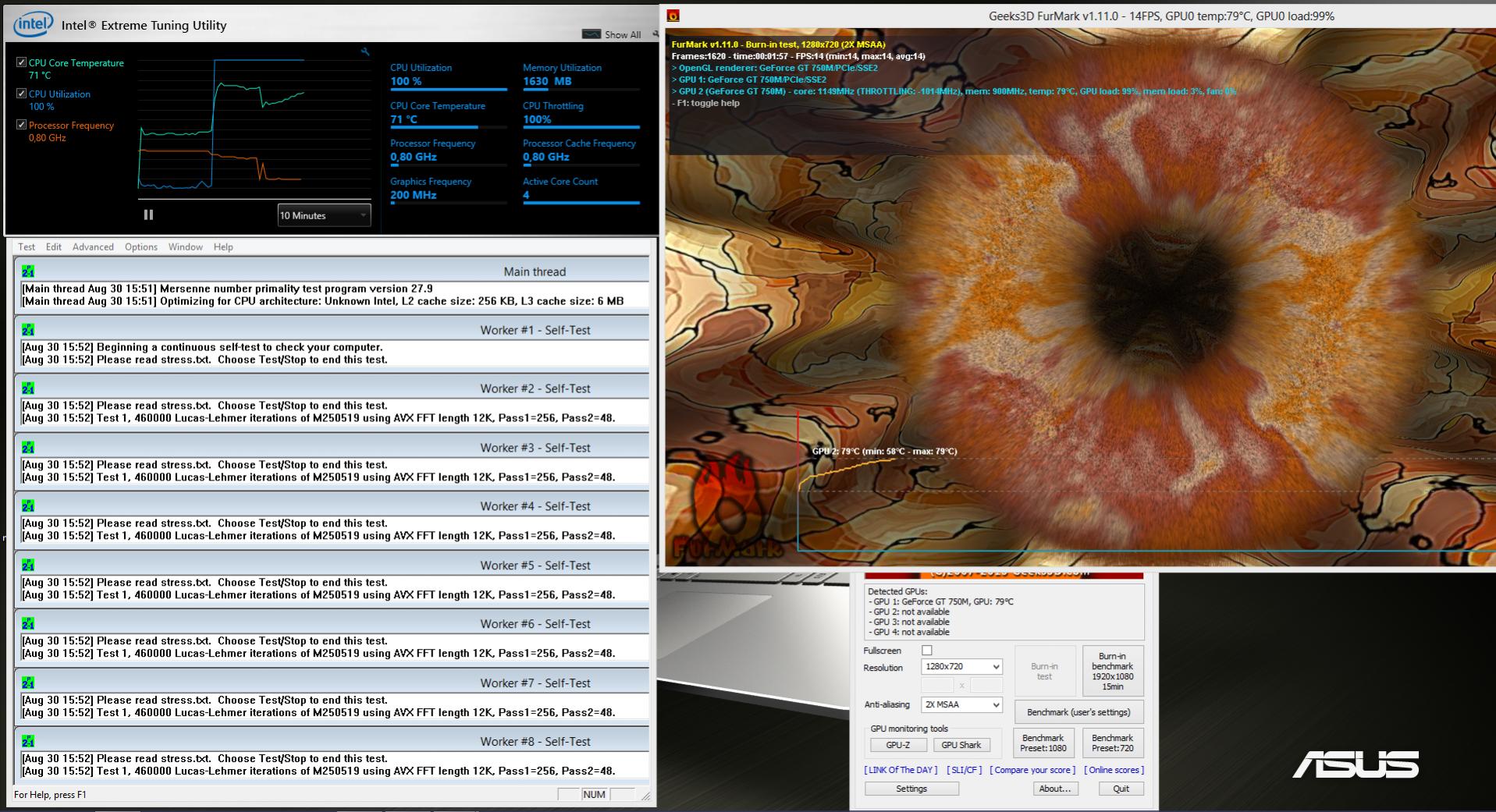 Hier könnt ihr sehen, wie es mit dem Takt der CPU bei Prime95 und Furmark aussieht, einmal ohne Furmark, einmal ohne ThrottleStop und einmal mit ThrottleStop.