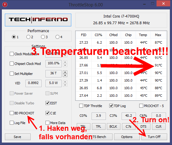 Die 91°C max. Temperatur rühren daher, dass ich während des Laufens von Prime und Furmark ThrottleStop aktiviert habe und somit die CPU von 800 MHz auf über 2,4 GHz gesprungen ist, weshalb die Temperaturen ebenso sprunghaft angestiegen sind, denn die Lüfter brauchen wie schon beschrieben einige Zeit bis sie wirken.