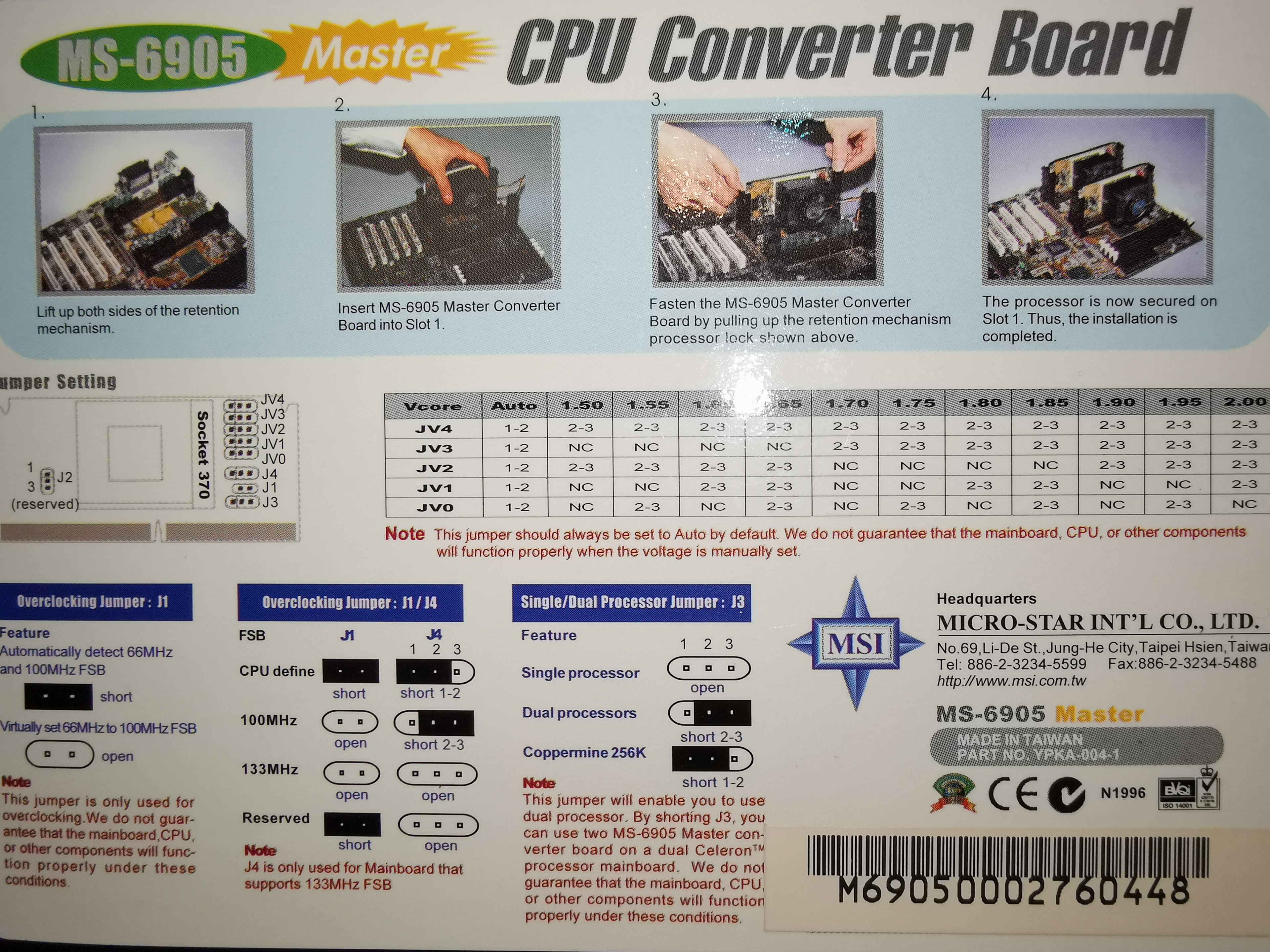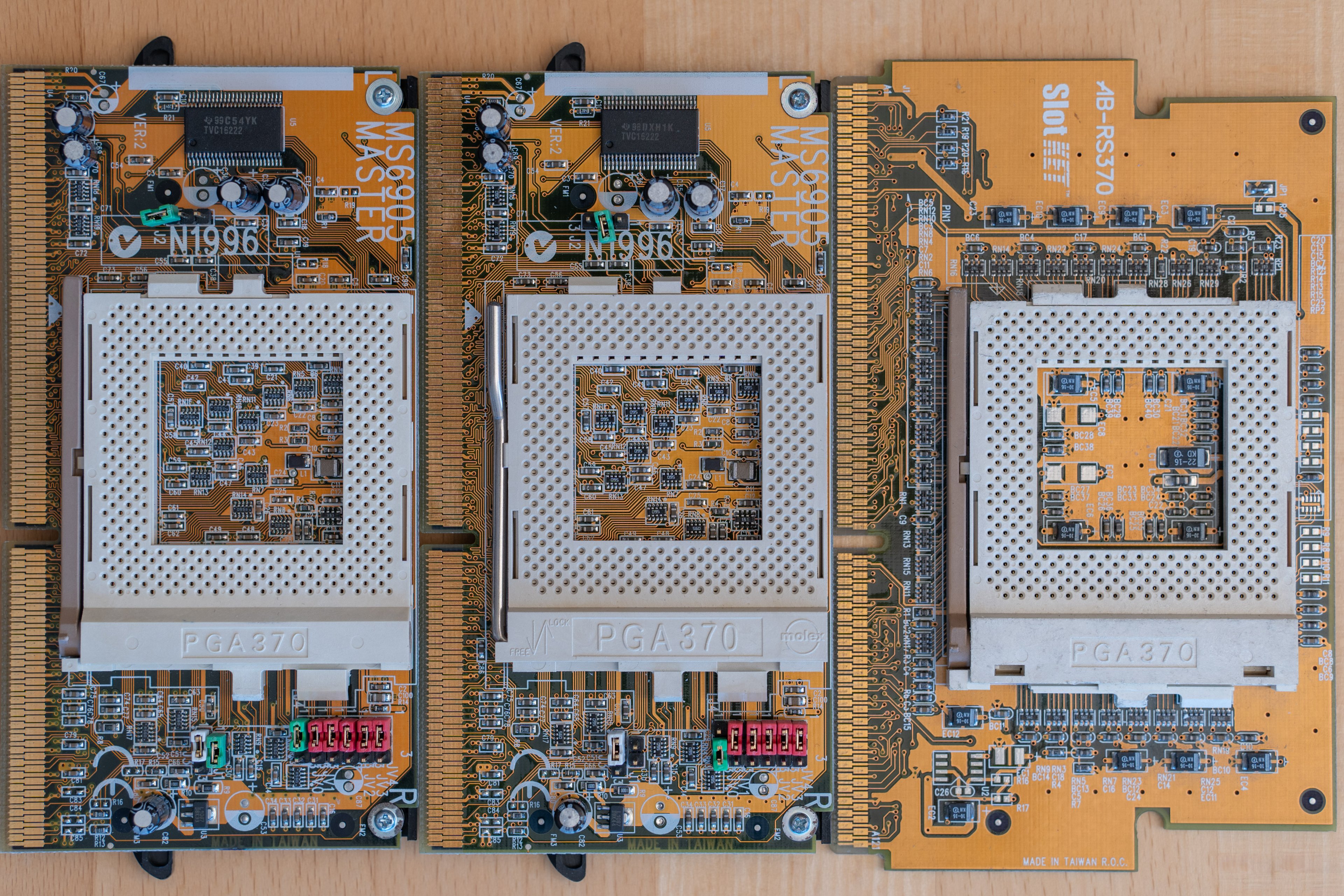 Auf meinem Gigabyte BX-2000 lief ein P3-750 Coppermine damit nicht, auch nicht mit einem Abit RS370 Slotket. Erst ein weiteres MS-6905 V2 brachte dann Erfolg. Optisch besteht zu den ersten beiden MSI kein Unterschied (lediglich der Hebel ist aus Metal statt Kunststoff), auch die Revision ist laut Aufdruck die selbe. Allerdings steht auf letzterem statt FCPGA- nun Coppermine-Ready.