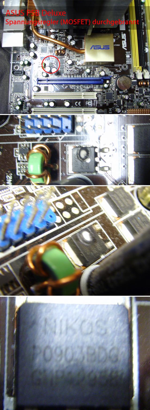 Leicht angekohlter Geruch aus dem Gehäuse ließ Schlimmes erahnen!! [Flugs den Rechner ausgeschaltet und auseinandergenommen] Nach kurzer Suche konnte ich einen offensichtlich durchgebrannten Spannungsregler (engl. abgk."MOSFET") auf dem Mainboard (ASUS P5B Deluxe) direkt neben der CPU ausmachen:
