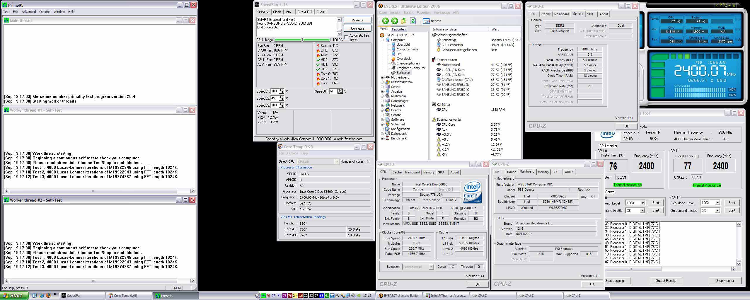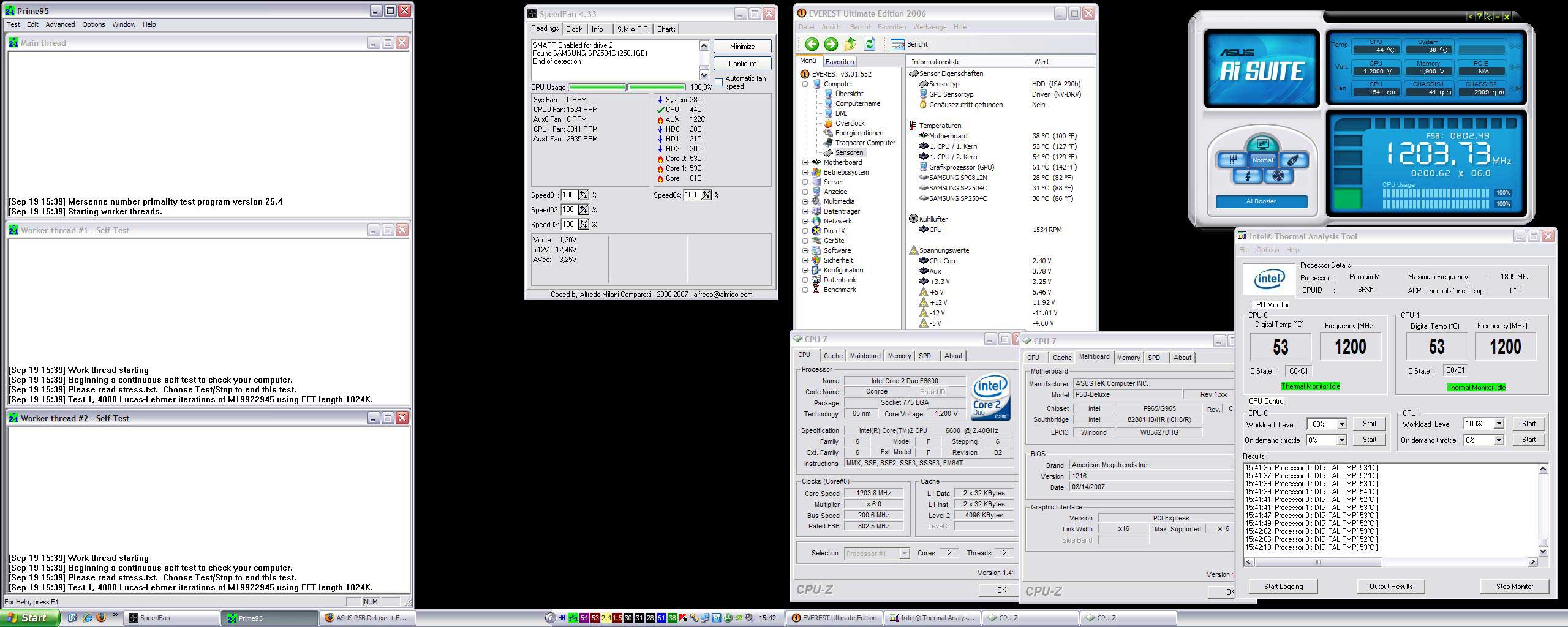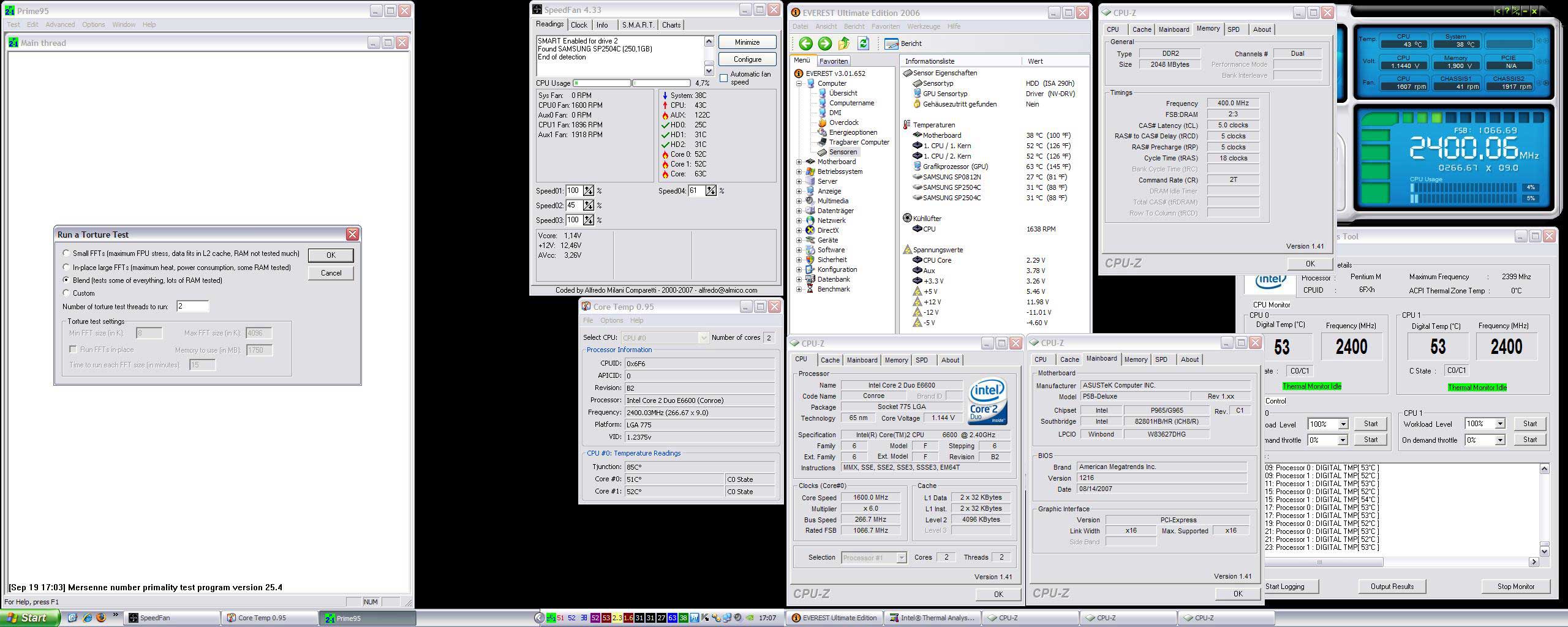 Ich wundere mich immer mehr über die VCore Werte die mir angezeigt werden. Wie im angehängten Screenshot zu sehen zeigen die Programme alle unterschiedliche Werte an (abgesehen von Everest, der zeigt den Wert von CoreTemp x2 an).