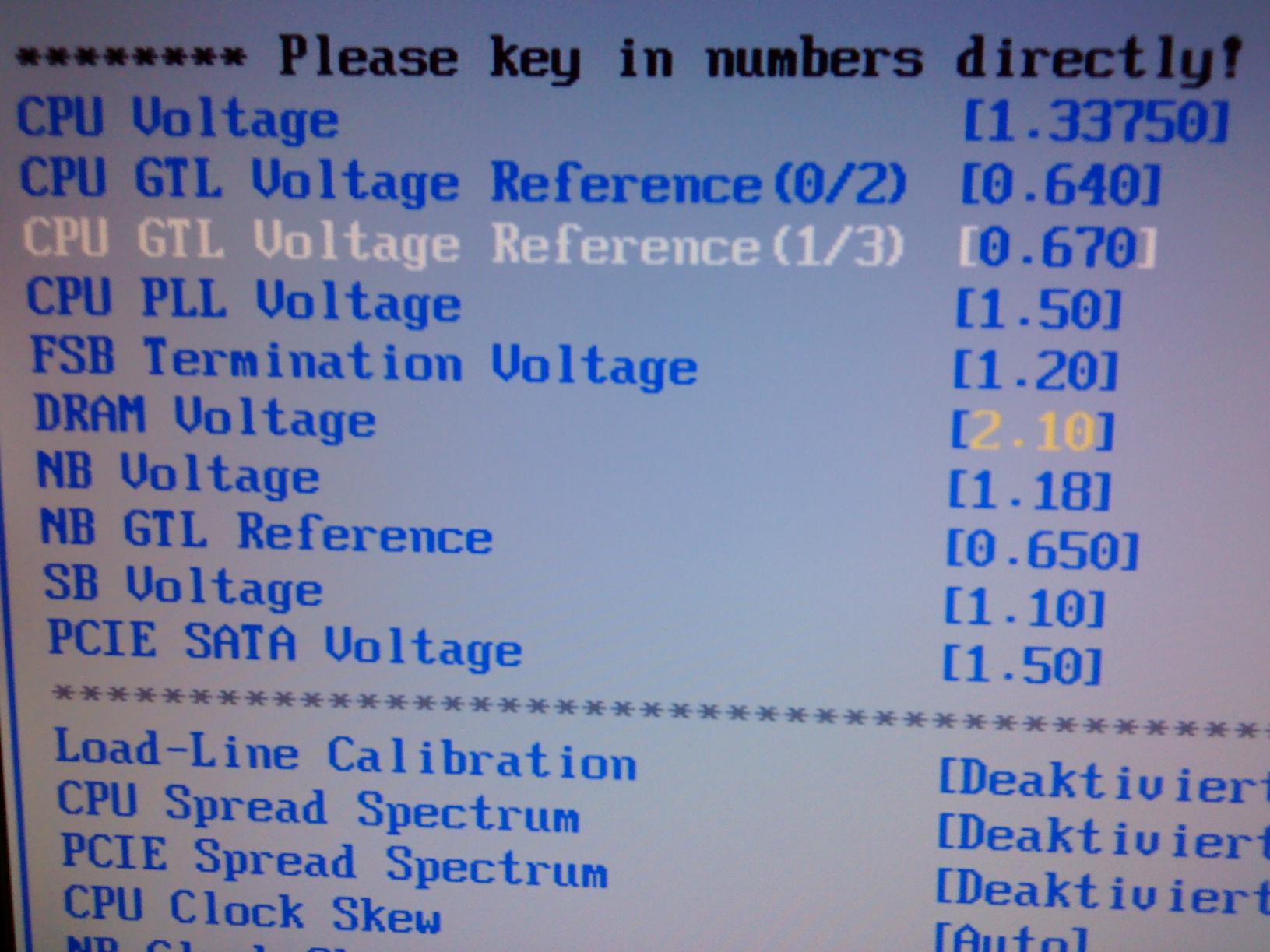 Bei CPU PLL Voltage sollte auf keinen Fall Auto oder die niedrigste Einstellung eingestellt sein. Hier am besten immer die zweitniedrigste nehmen, sonst overvoltet das Board stark. Zweitniedrigstes is glaub 1,52V. Hab das Bios leider grad net vor mir.