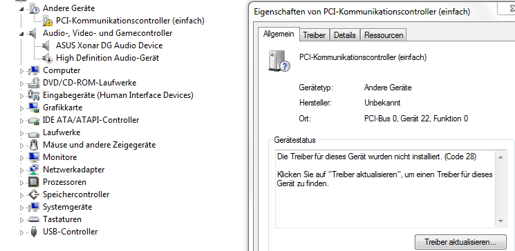 Außerdem habe ich im Geräte Manager ein unbekanntes PCI Kommunikationskontrollgerät.