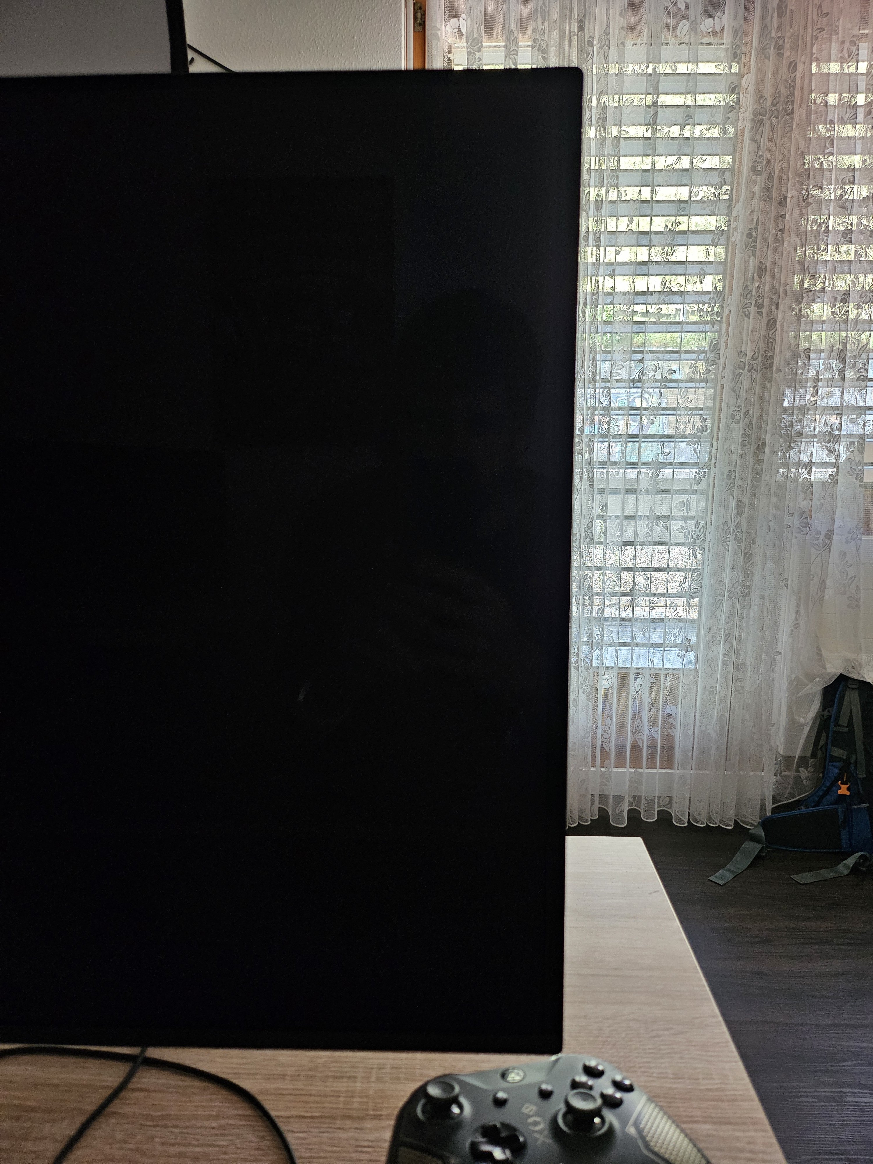 Bild 1 (unterbelichtet) zeigt meine Lichtsituation. Bei Sonne unterliegt der Monitor keinem direkten sondern eher unterdrücktem Sonnenlicht. Da das Bild unterbelichtet ist, wirkt hier das Display auch Schwarz, wie es sein sollte. Der Bildschirmrand und das Panel sind kaum zu differenzieren. Auch erkennbar sind einzelne diffuse Lichtpunkte auf dem Panel.