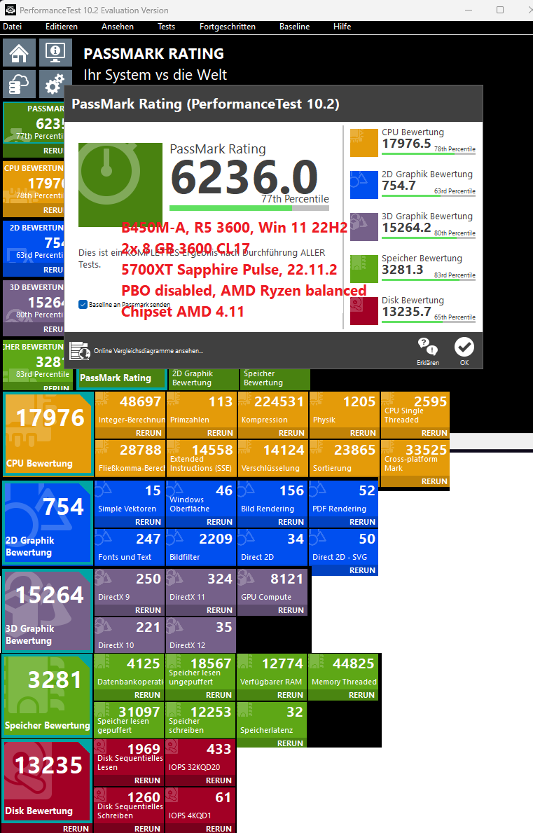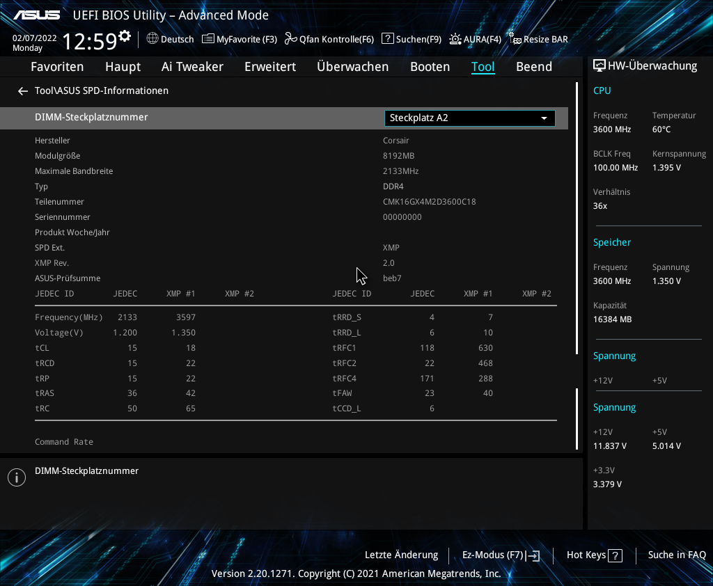 - RAM: 2x 8 GB 3600 MHz CL18 auf A2 und B2, Corsair VENGEANCE LPX 16 GB (2 x 8 GB) DDR4-3600 CL18 (auch vom Juni '20)