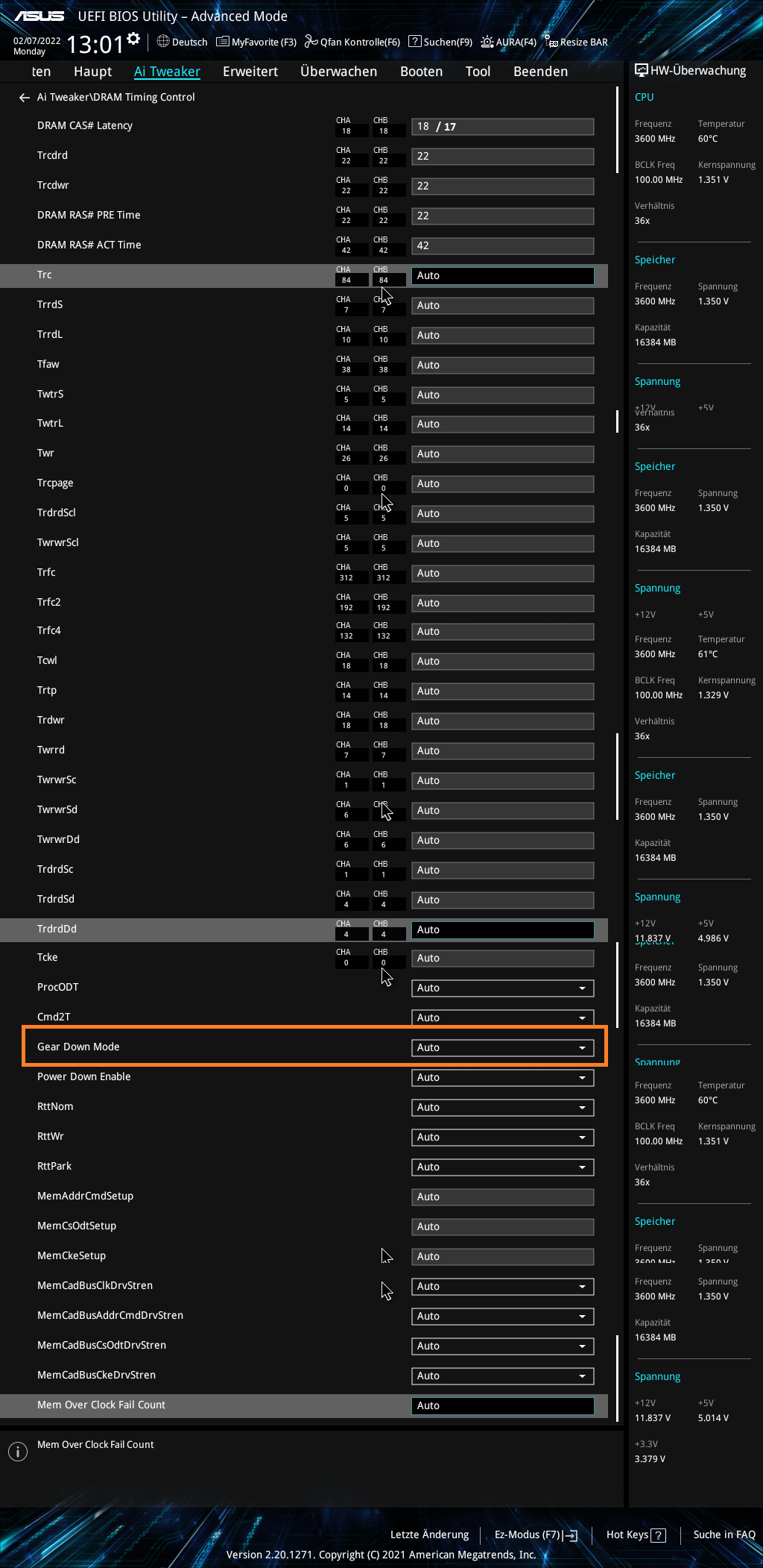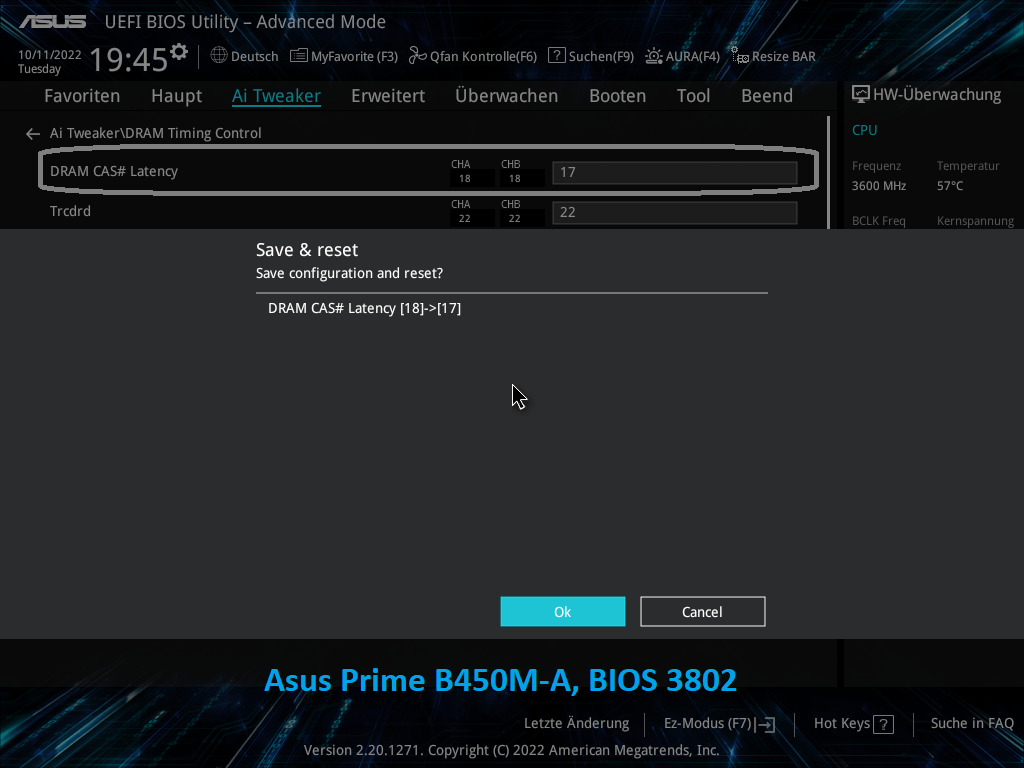 d) Jetzt noch die Taktfrequenz manuell auf DDR4-3600 gestellt, beim Speichern die Änderung bestätigt, damit ist die CAS Latency wieder auf 18 zurück gesprungen (statt CL17).
