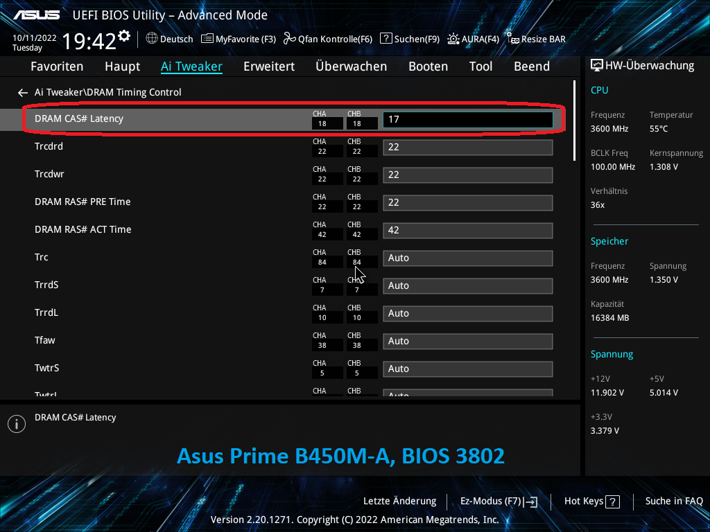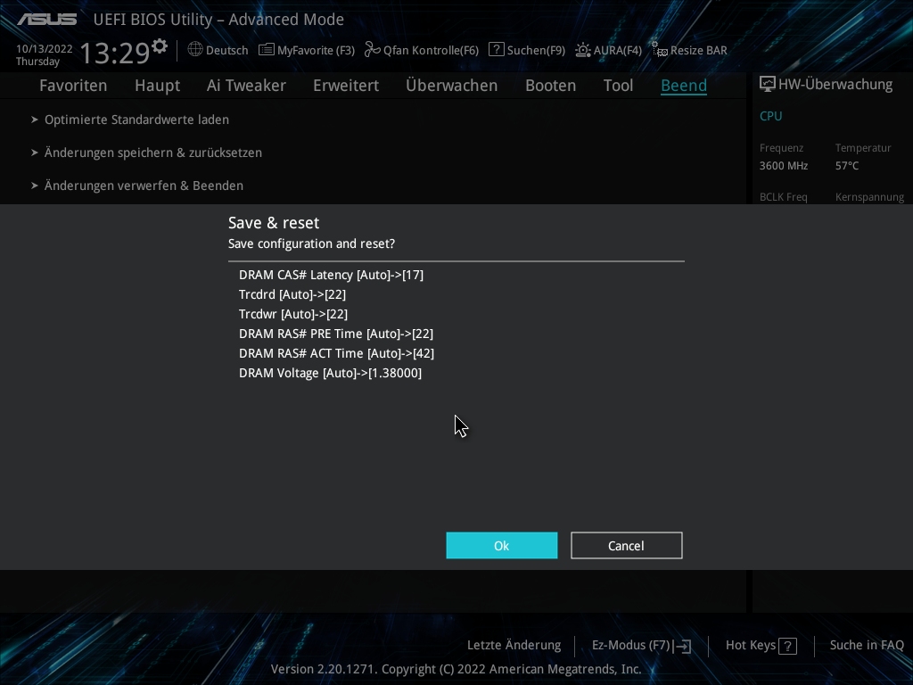 c) DRAM-Timings, Spannung und Frequenz auf defaults, und dann die Timings 17-22-22-22-42 mit 1,38 Volt Speicherspannung (bei 1,40 Volt ging die Farbe schon auf violett über) manuell eingegeben, und gespeichert. Beim "Save & Reset" werden die Einstellungen noch bestätigt, und es wurde auch CL17 übernommen (noch mit DDR4-2133).