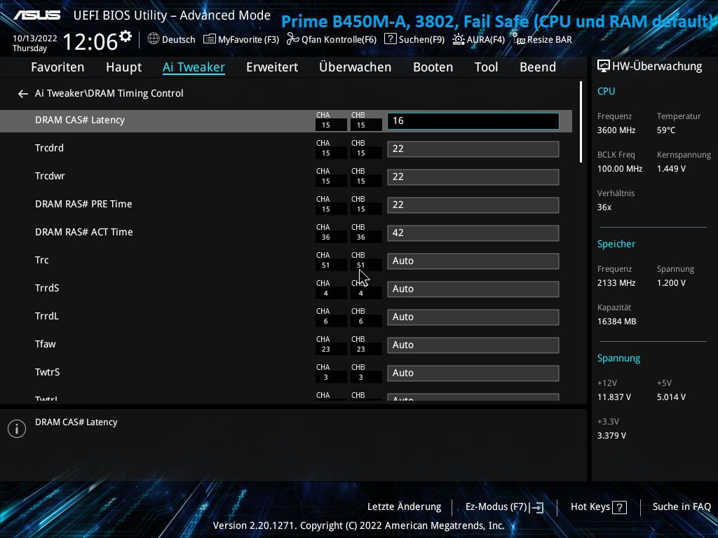 b) jetzt habe ich wieder in der anderen Richtung, mit CL16 experimentiert. Ergebnis: Board ging nach drei Fehlstarts in den Fail Safe Mode, wo der Speicher dann mit default-Werten (2.133 MHz CL15) läuft.