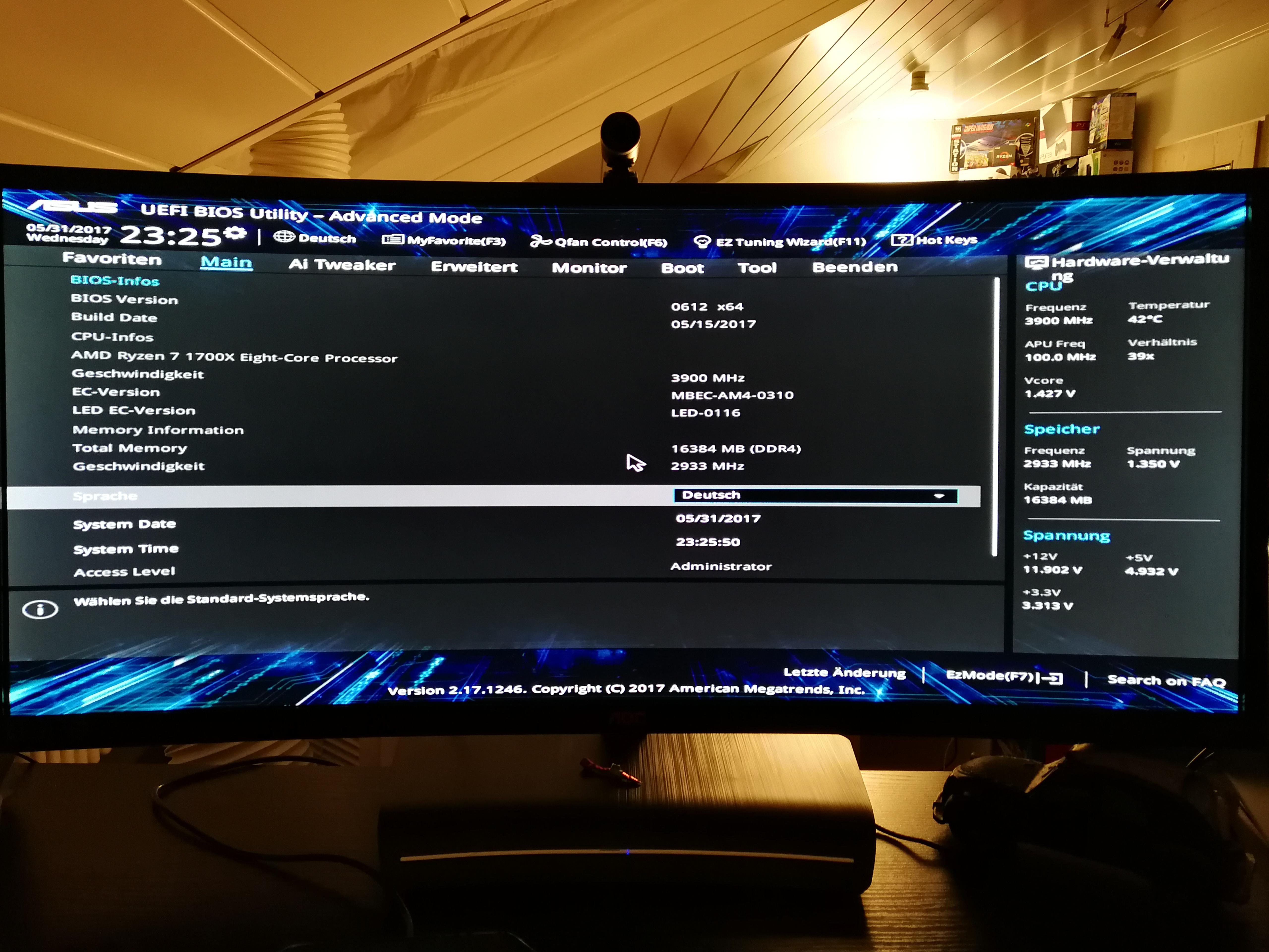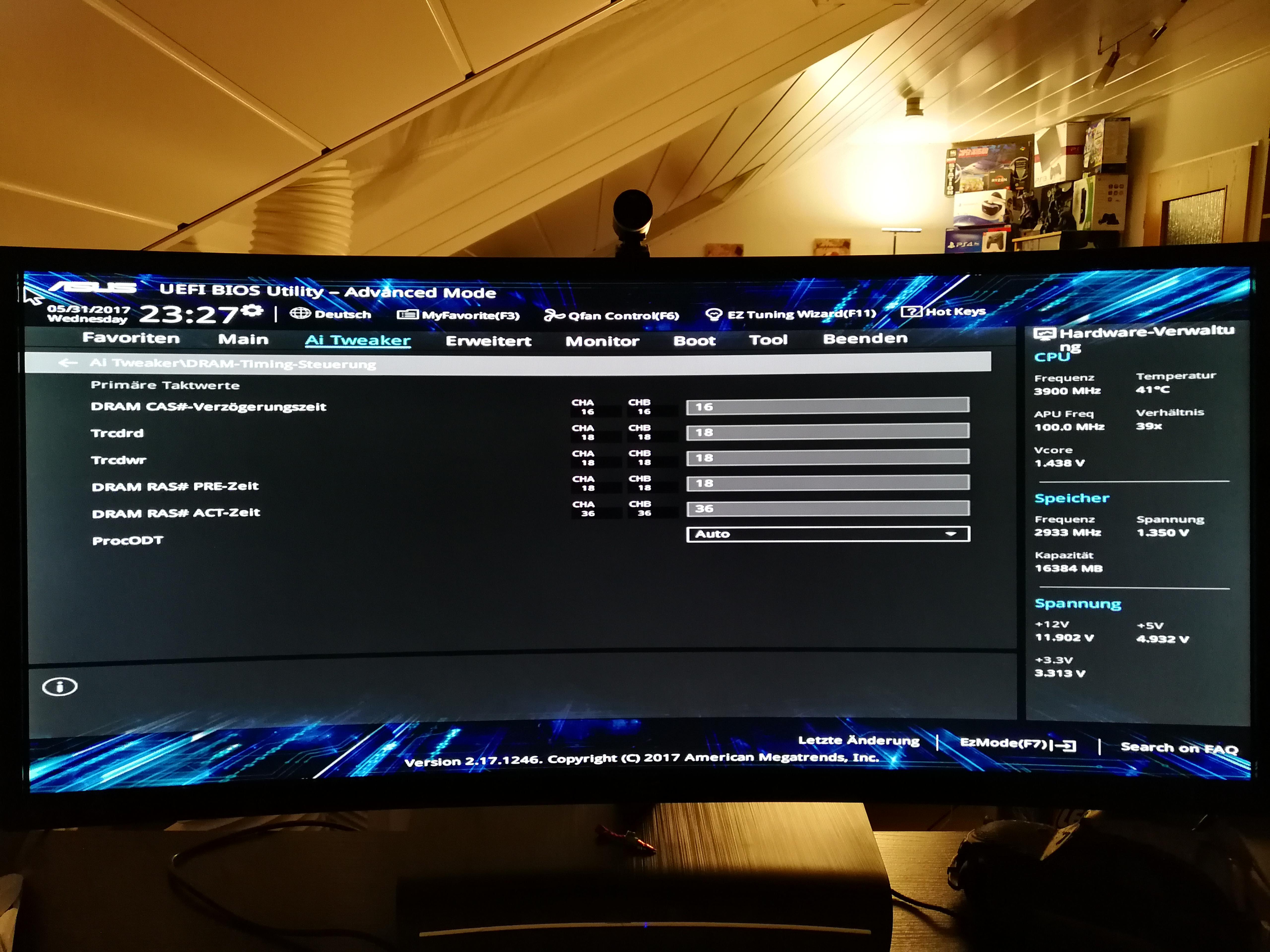 Im BIOS D.O.C.P. an, Speicher auf 2933 MHz. Er stellt automatisch 1,35V Spannung ein. System läuft.