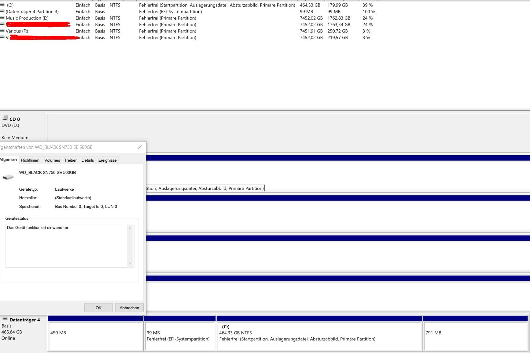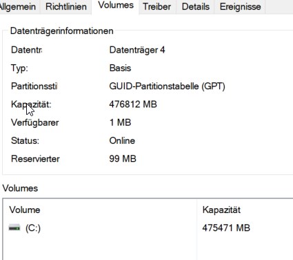 Bild von der Datenträgerverwaltung unten von der Balkenansicht Posten und halt mal Rechtsklick links da auf Datenträger 1 (oder die Nummer deiner SSD) machen, Eigenschaften wählen und ein Bild vom Reiter Volumes ein Bild Posten