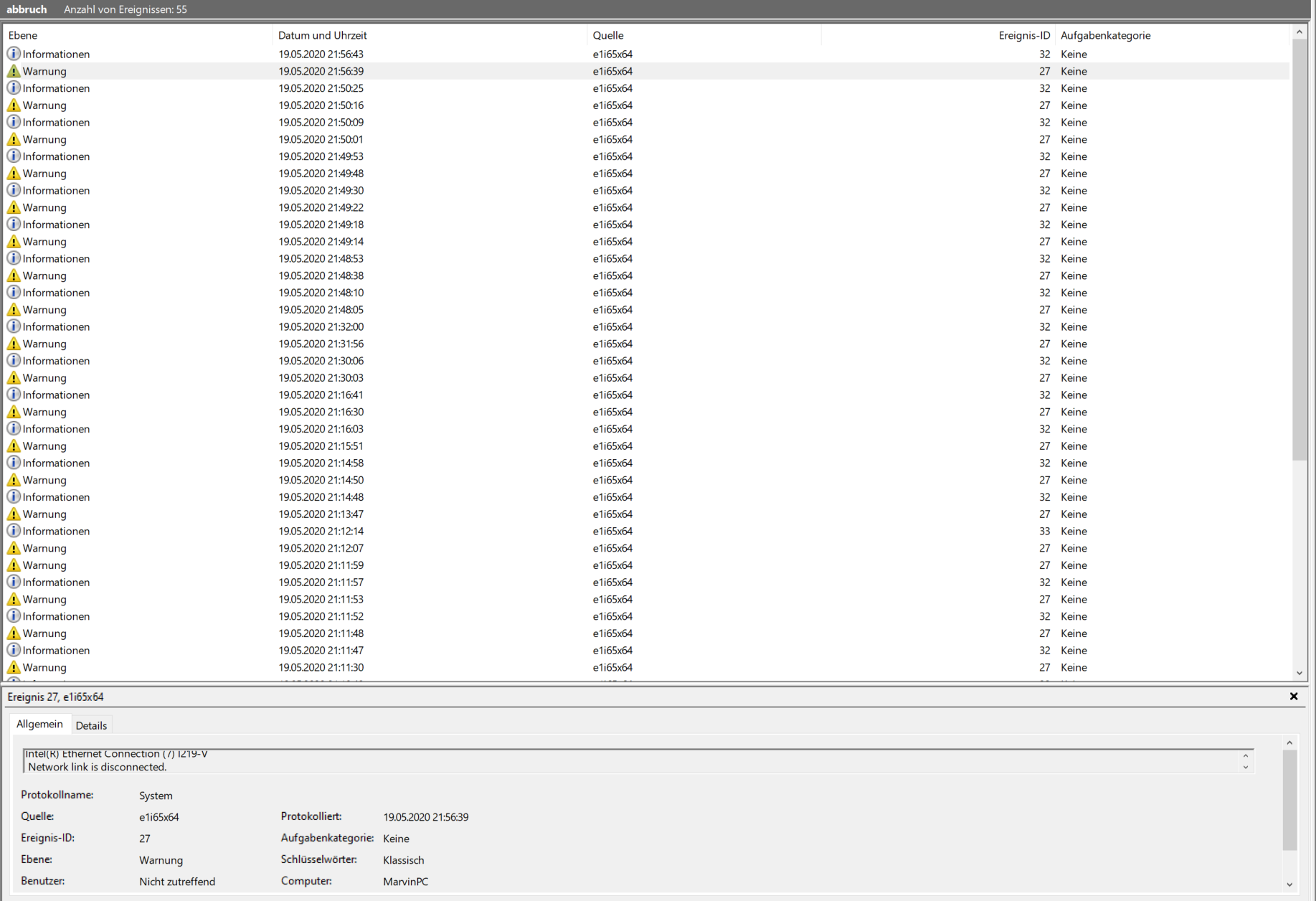 Mein Eventviewer sieht wie im Anhang aus. Warnungen sind Disconnects (Kabel entfernt) und die Ausrufezeichen die Wiederverbindungen.