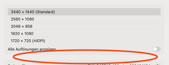Das führt dazu, dass normale 4K UHD, oder 8K Displays mit macOS nicht gut funktionieren (163 ppi bei 27" 4K UHD). Dann muss tatsächlich skaliert werden, was den Leistungsanspruch an GPU und CPU nach oben zieht. MacOS läuft dann nicht mehr mit seiner nativen Auflösung. Darum arbeitet man bei macOS mit der Angabe "sieht aus wie". Das Display arbeitet immer mit der nativen Auflösung, die UI aber immer mit 109 ppi, oder einem geraden Teiler der nativen Monitorauflösung. Wenn du einen 27" UHD mit macOS betreibst, hast du winzige Schrift und Icons, möchtest du das nicht, musst du auf FHD umstellen. Dann hast du (zu) große Schrift und Icons, aber dank 4K UHD messerscharf. Ein 8K Display müsste man mit macOS also mit UHD-, oder FHD-Auflösung betreiben, je nachdem wie groß es ist. UHD bei 54" 8K und FHD bei 27" 8K bspw.