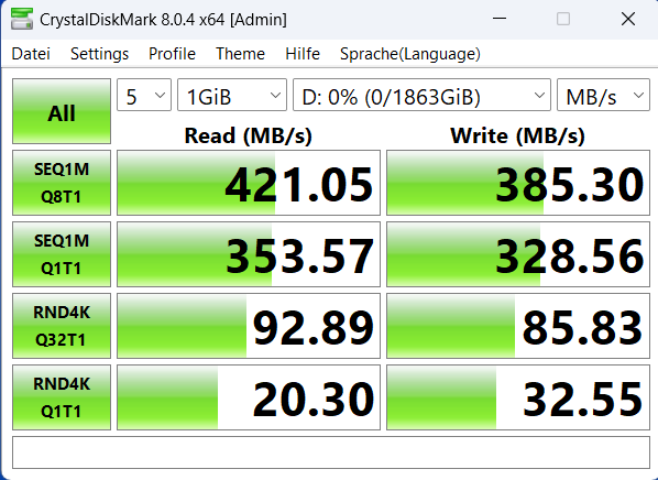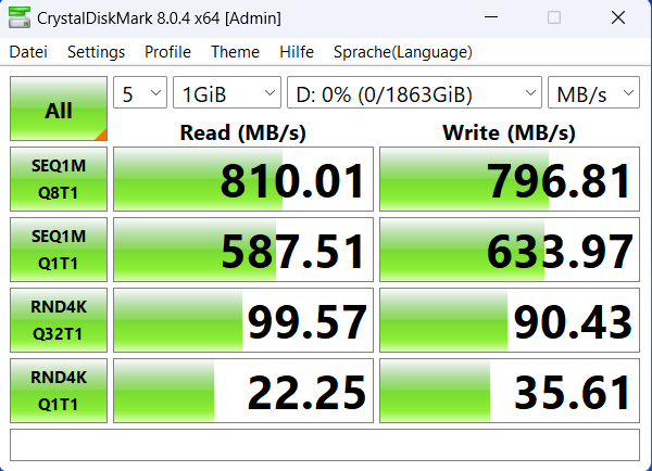 Mit diesen Einstellungen hatte ich zwar schon mal getestet, damals aber keinen Unterschied festgestellt. Ich habe jetzt noch mal auf DP1.4+USB3.2 gestellt und die SSD ist immerhin etwas schneller. Das ist dann wohl das Maximum, wenn man über den Monitor geht. Da muss ich überlegen, ob ich die Docking Station doch behalte.