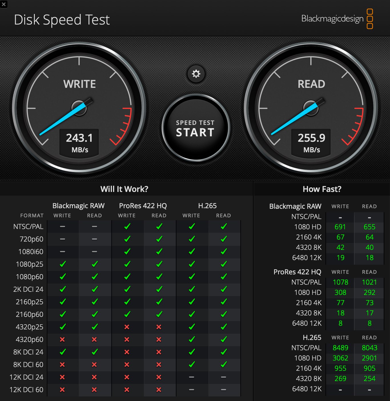 Beispiel SSD, getestet mit Blackmagic Disk Speed Test: