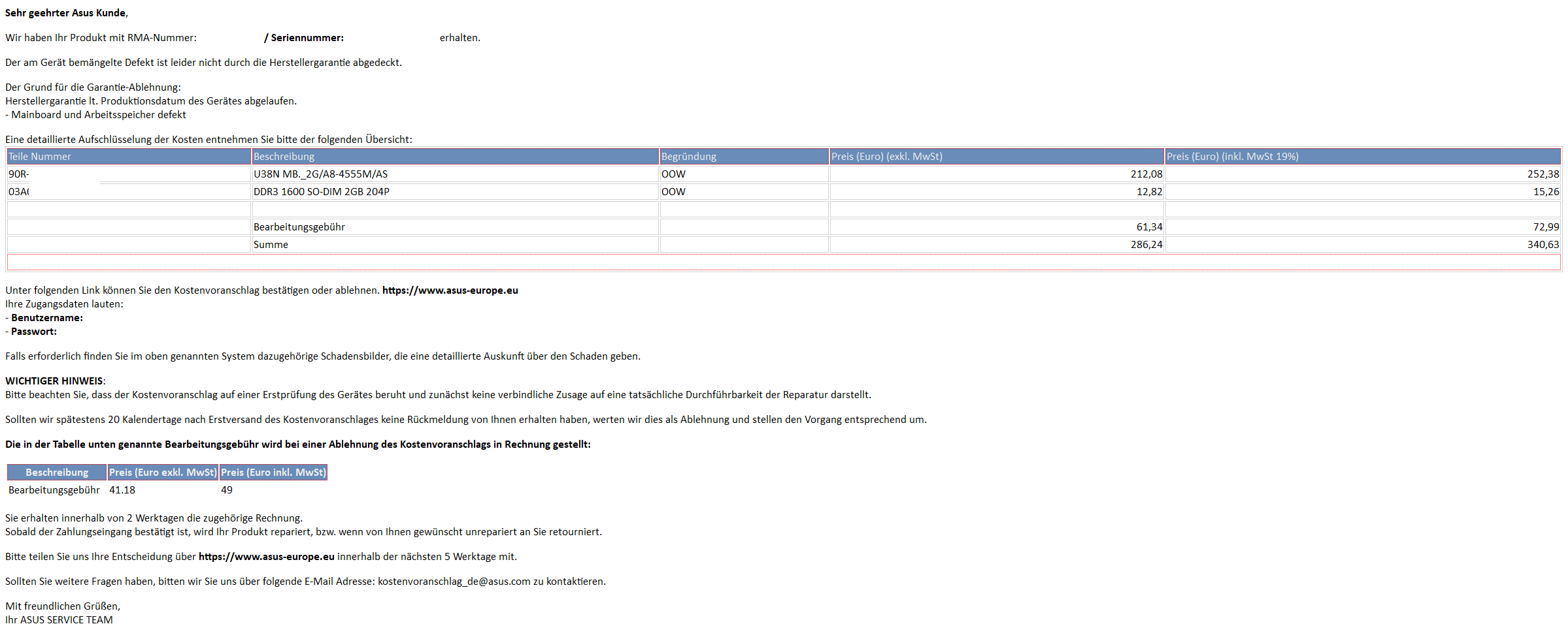 Nun sende ich den Laptop auf eigene Kosten zu dem Reparaturservice und bekomme wenige Tage später eine Mail, in der doch glatt steht, dass mein Mainboard und RAM defekt sei und für die Reparatur und die Kosten belaufen sich dabei auf 340€!