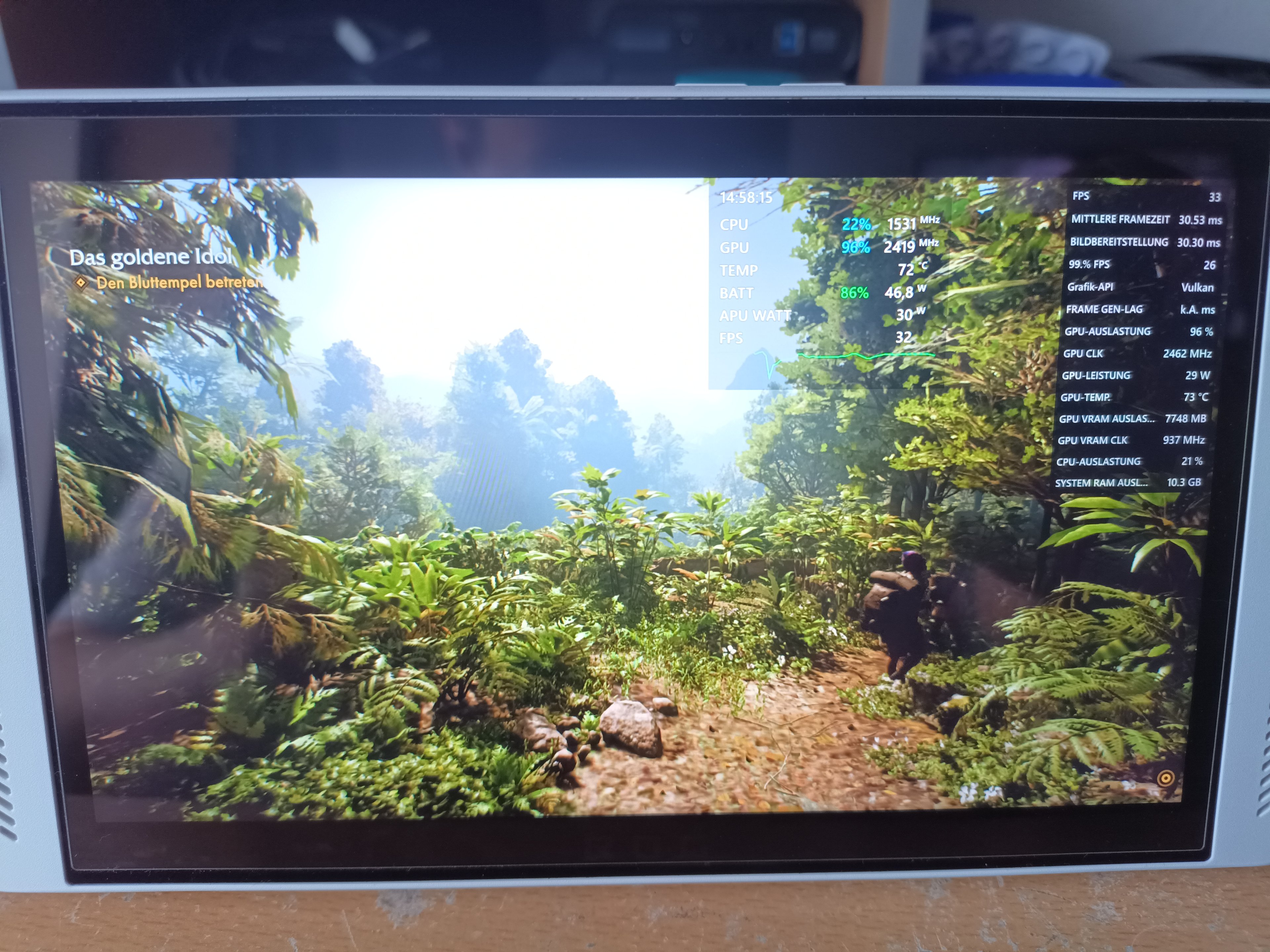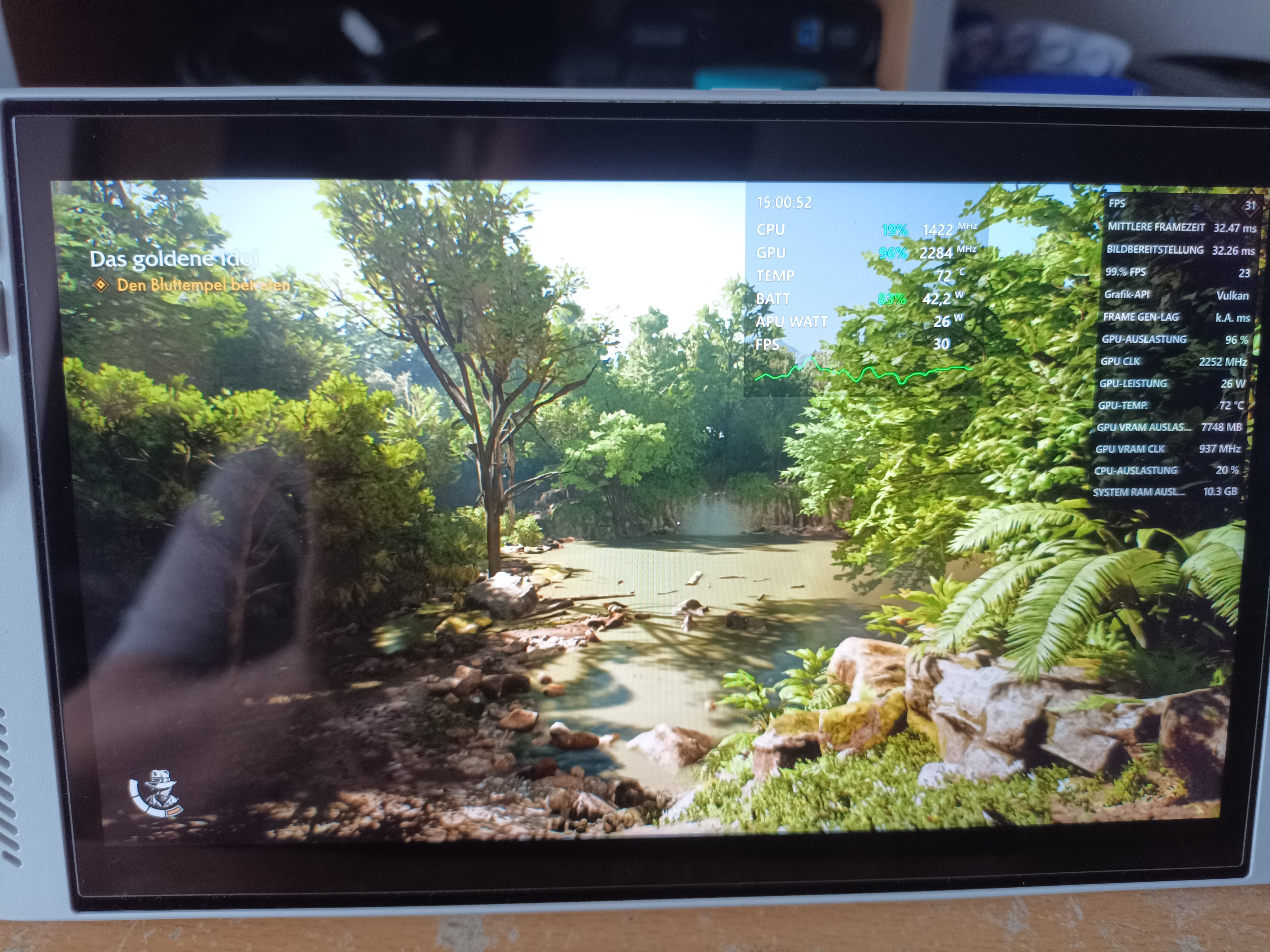 Hab hier noch zwei Screens von Indiana Jones und der Große Kreis gemacht, bei 25W TDP einstellung (also Turbo-Modus), 900p, XeSS, und mittleren Details - nur um zu zeigen, was so an RAM und VRAM verbraucht wird.