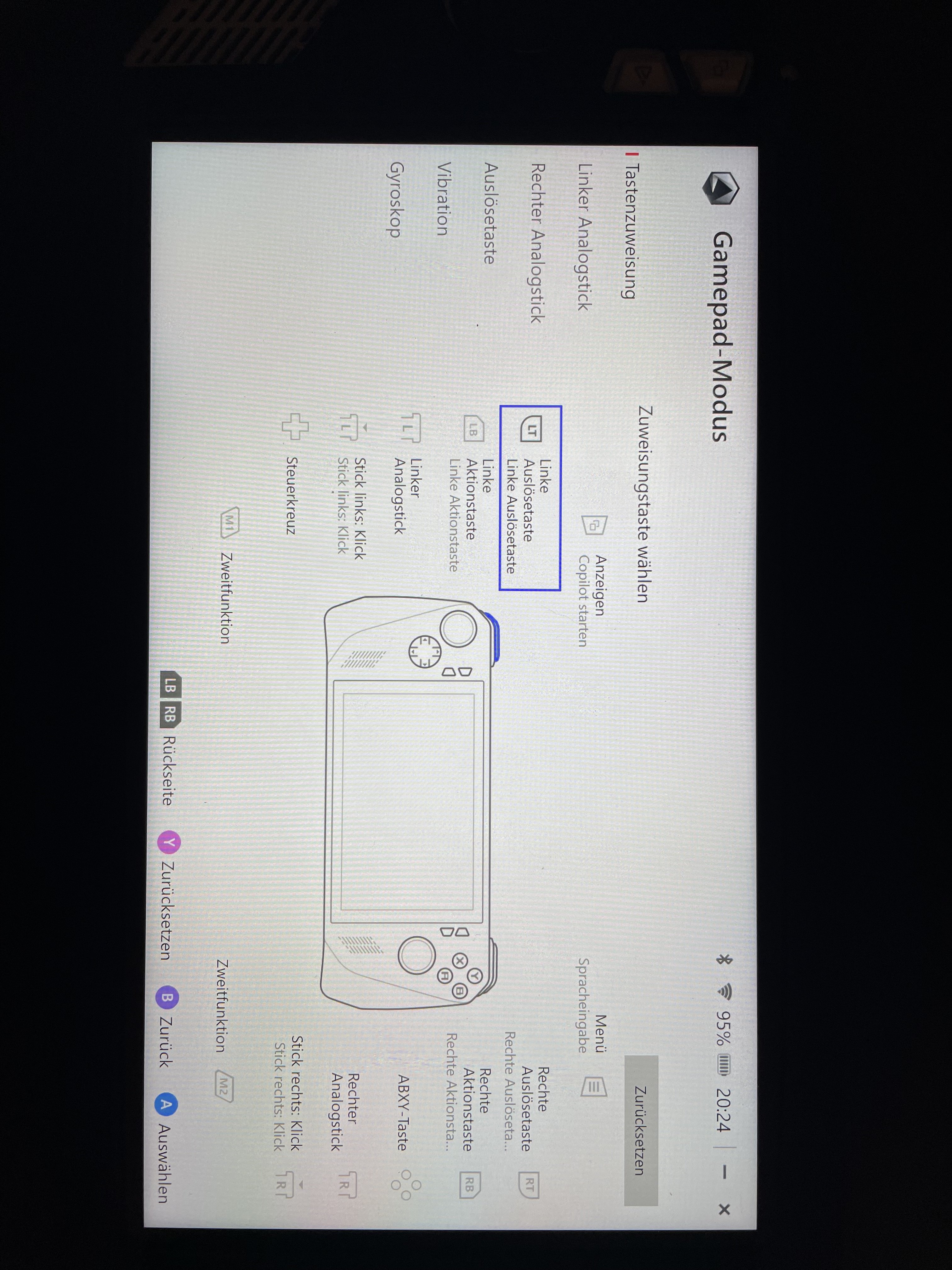 Wenn ich online einen Gamepad Tester starte zeigt auch der keine Reaktion auf die Eingabe von RT/LT. Alle anderen Tasten funktionieren aber ohne Probleme und wenn ich RT/LT auf eine andere Taste lege funktioniert es auch.