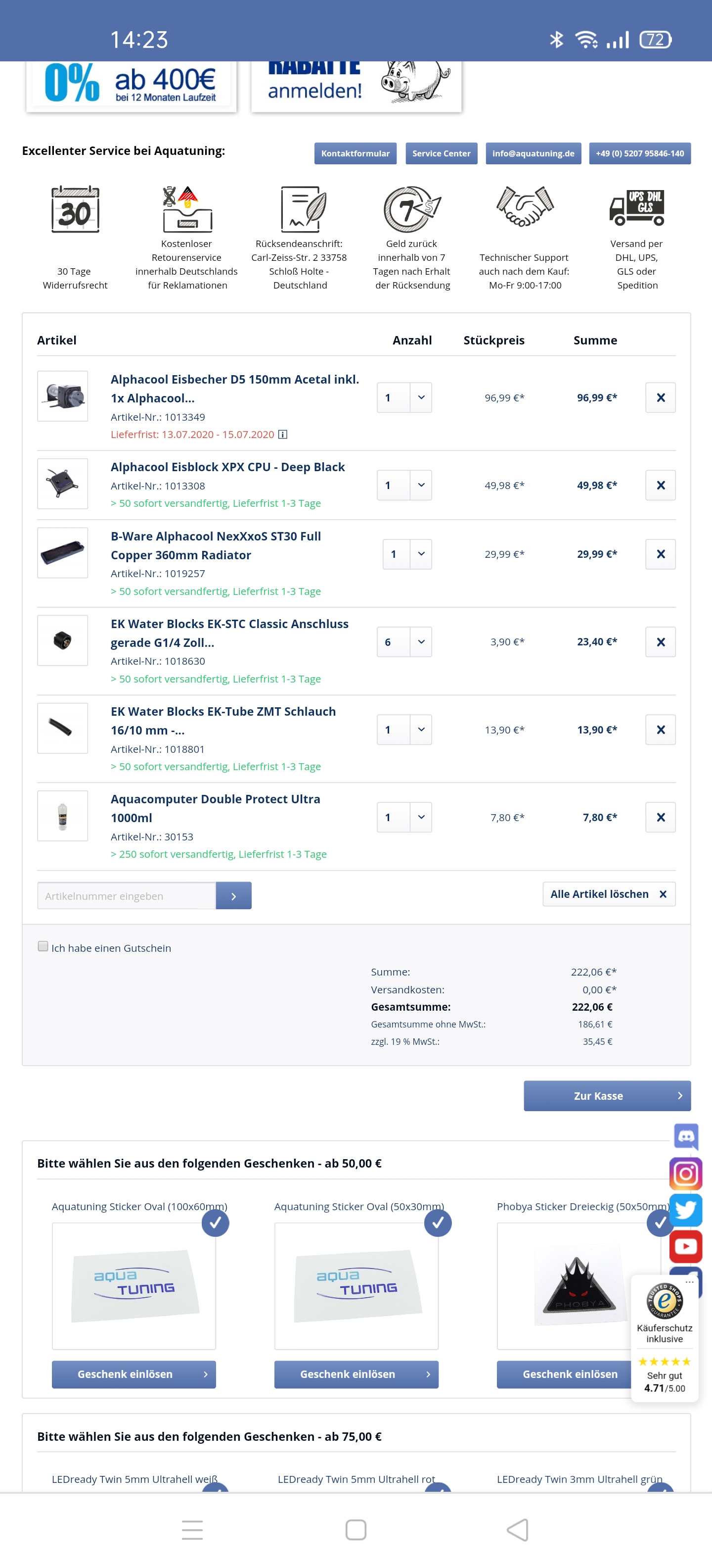 Die Lüfter sind gut sind umgelabelte Silent Wings und selbst wenn man Schläuche und Kühlmittel dazu kauft ist das Set noch Mega günstig gib die Teile mal einzeln ein.immortuos schrieb:Schlauch, Lüfter und Kühlmittel sind für die Tonne, sonst ganz ok. Ich würde keine Fertigsets kaufen.