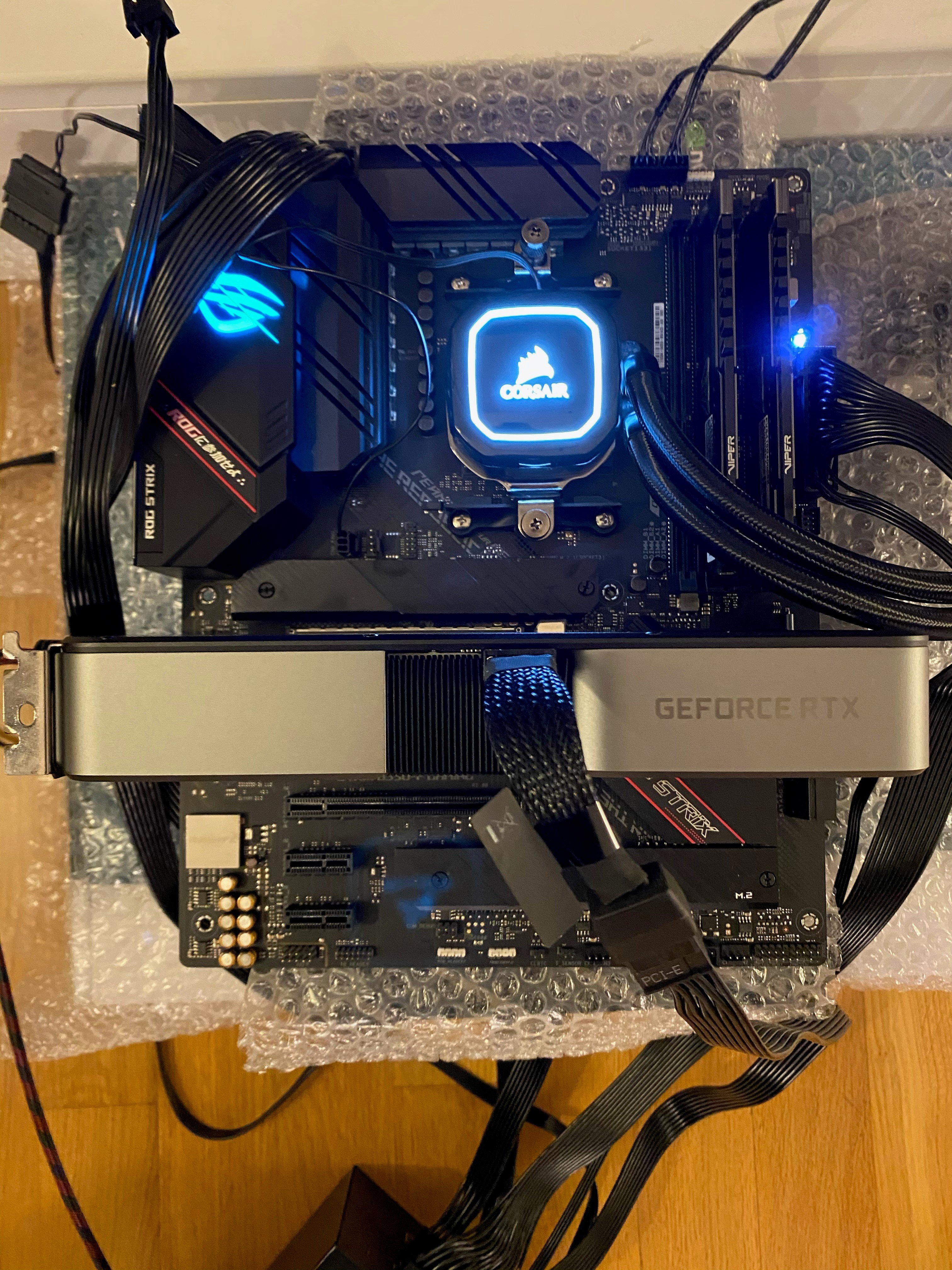 Wenn ich überbrücke geht alles an aber es leuchtet nach wie vor die weiße LED (Fehler vga) und ich bekomme kein Bild. Das vorne an der gpu ist ein Adapter, ohne den ich die Karte nicht anschließen kann. Wurde extra mitgeliefert.