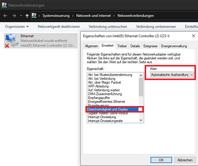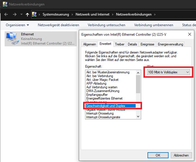 Wake on Lan und die Stromoptionen habe ich auch deaktiviert, Die Bandbreite habe ich im LAN Controller auch umgestellt.