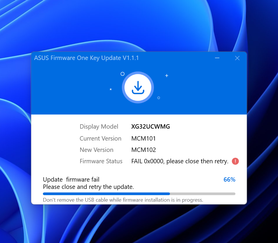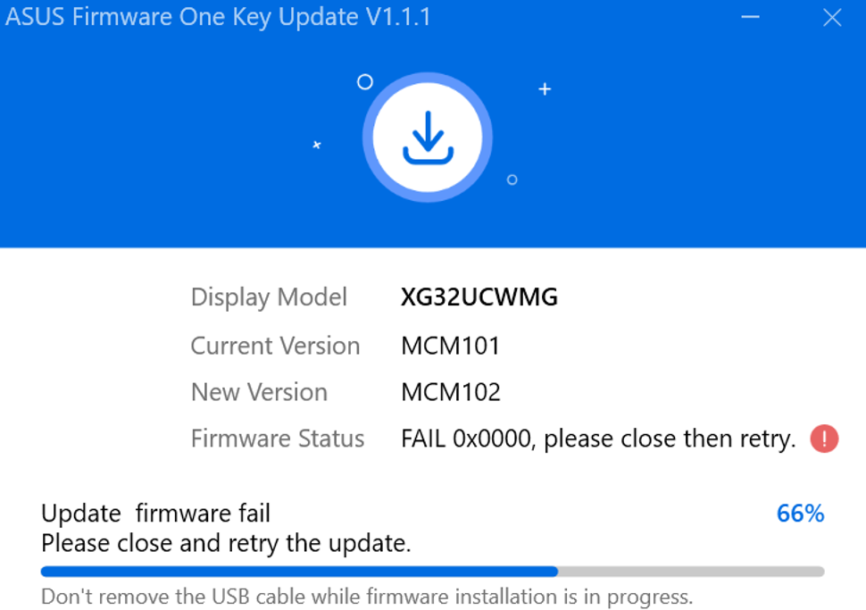 Leider funktioniert es mit den Firmware-Updates nicht so gut und im Internet sind auch sehr viele Fälle dazu bekannt. Im Einzelnen hat es aber dann doch geklappt. Mit der Version MCM102 gab es einen Fehler mit 66%. Mit der Version MCM103 wurde der Monitor nicht gefunden und das Update abgebrochen.
