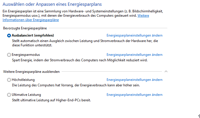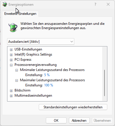 ...in Windows Energie Einstellung minimaler Leistun gszustand des CPUs auf 1 % gestellt