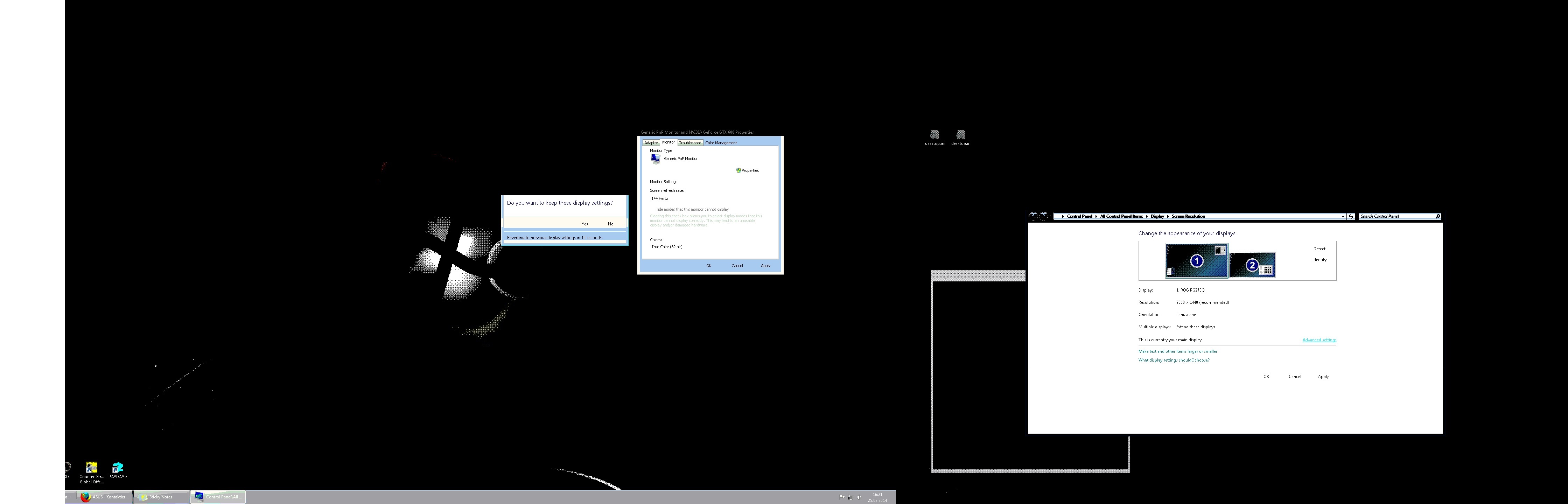 2. Wenn ein zweiter Monitor (60hz, HDMI) verbunden wird, ist ein betrieb bei 144hz anscheinend nicht mehr möglich. Spiele wie CS:GO fallen auf max 120fps zurück. Der Versuch, in windows fest 144hz einzustellen, wird mit einem "zerstörten" Bild des desktops bestraft. Ist der 144hz modus im Multi-Monitor-Betrieb nicht mehr unterstützt? Würde ein Wechsel auf z.B. DVI etwas bringen? (siehe screenshot)