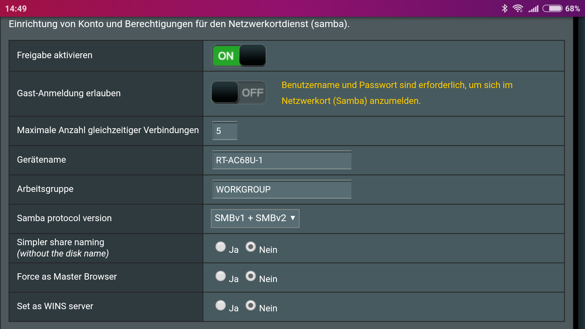 Ich hatte als Verlängerung/Erweiterung ein Fritzbox genutzt. Nun habe ich diese verkauft und meine Asus Router mit Merlinwrt wieder hingestellt. Da ich noch eine 2TB 2,5 Zoll übrig habe und sonst keine Verwendung dafür finde, habe ich dir am Router angeschlossen. Diese wird auch sofort gefunden und sobald ich diese öffnen will, kommt das Fenster mit Benutzername und Passwort. Mit dem Asus Router wird die Festplatte unter Android und Windows gefunden aber nicht unter Ubuntu. Die Abfrage erscheint gar nicht, kommt nur die Meldung das ich keine Rechte habe, um auf diese zuzugreifen. Aktiviere ich jetzt "jedem im Netzwerk erlauben", dann funktioniert es ohne Probleme.