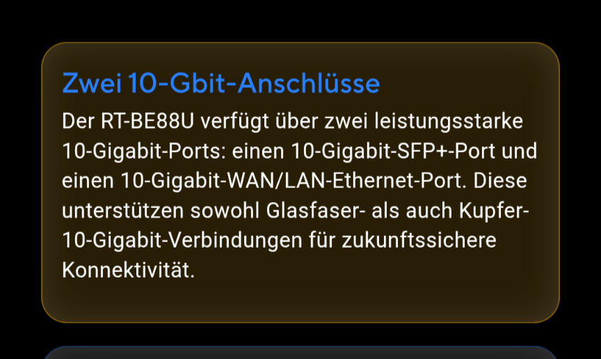 Jedoch bin ich mir nicht ganz sicher, ob der Asus das überhaupt kann. Denn ich muss ein 10GB/s Port für den Router vom Provider verwenden über RJ45. Wenn ich jedoch die Rückseite des Asus Router anschaue, habe ich nur ein 10GB/s Port über RJ45.