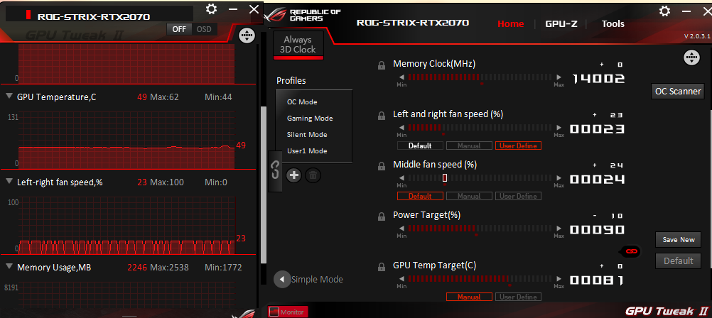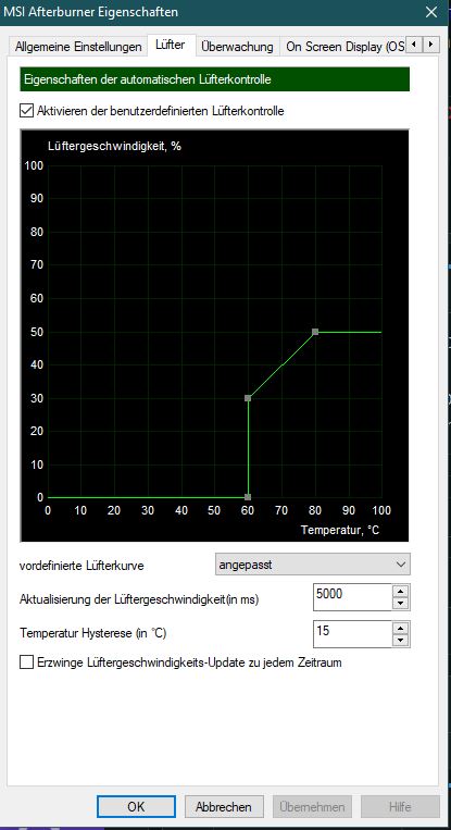 Ich habe seit gestern eine 2070 Strix in meinem PC verbaut. Diese hat Probleme mit dem Lüfter, welcher ständig anfährt und ausgeht, wie im Screenshot zu sehen. Nach der Lüfterkurve sollten die Lüfter erst bei 55°C angehen, jedoch laufen sie egal bei welcher Temperatur ständig an. Hat noch jemand dasselbe Problem, oder weiß, was man dagegen tun kann?