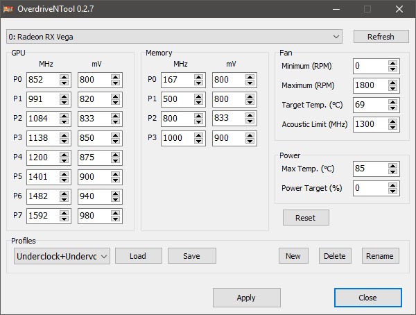 Folgende Beispielwerte bei meinen aktuellen UV Settings, alle jeweils bei 99-100% GPU Last zur Veranschaulichung: