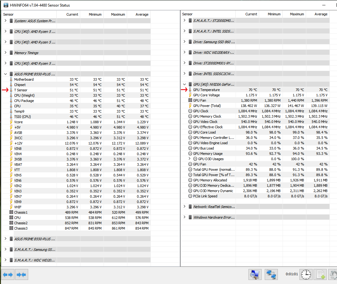 Werte in HWInfo sehen wie folgt aus (Diablo2R läuft). Hatte vorher Temperaturen um die 75°C, da die Lüfter nur nach der CPU Temp gesteuert wurden und diese bei D2R beispielsweise aber kaum ausgelastet wird. Nun ist die Temp bei maximal 70°C ingame.
