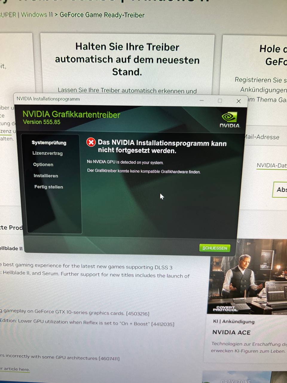 Versucht Manuell einen Treiber zu installieren, endet jedoch mit der Fehlermeldung dass keine Grafikkarte erkannt wurde...
