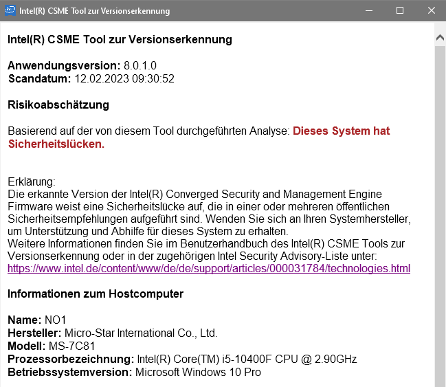 Vor und nach dem Update zeigt das Intel CSME Tool jedoch an, dass das System verwundbar ist.