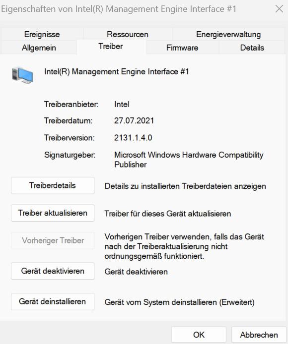 Bei der Windows 11 Pro Neuinstallation habe ich festgestellt, dass Windows den Intel ME Treiber selbst installiert und da BIOS auf 2602 sind und die Intel ME Firmware auf 14.1.51.1528 ist, kann es nur am Treiber liegen.