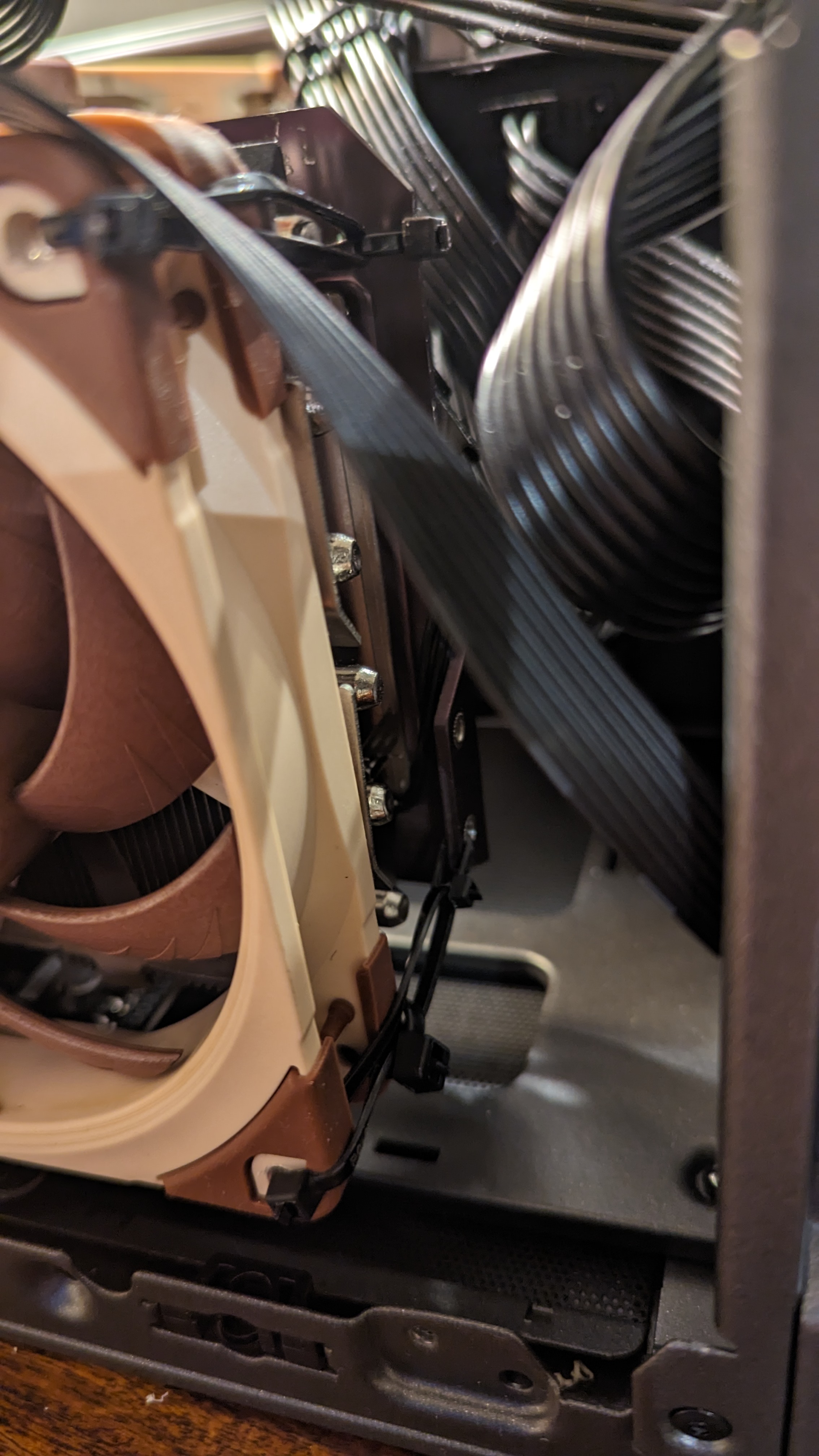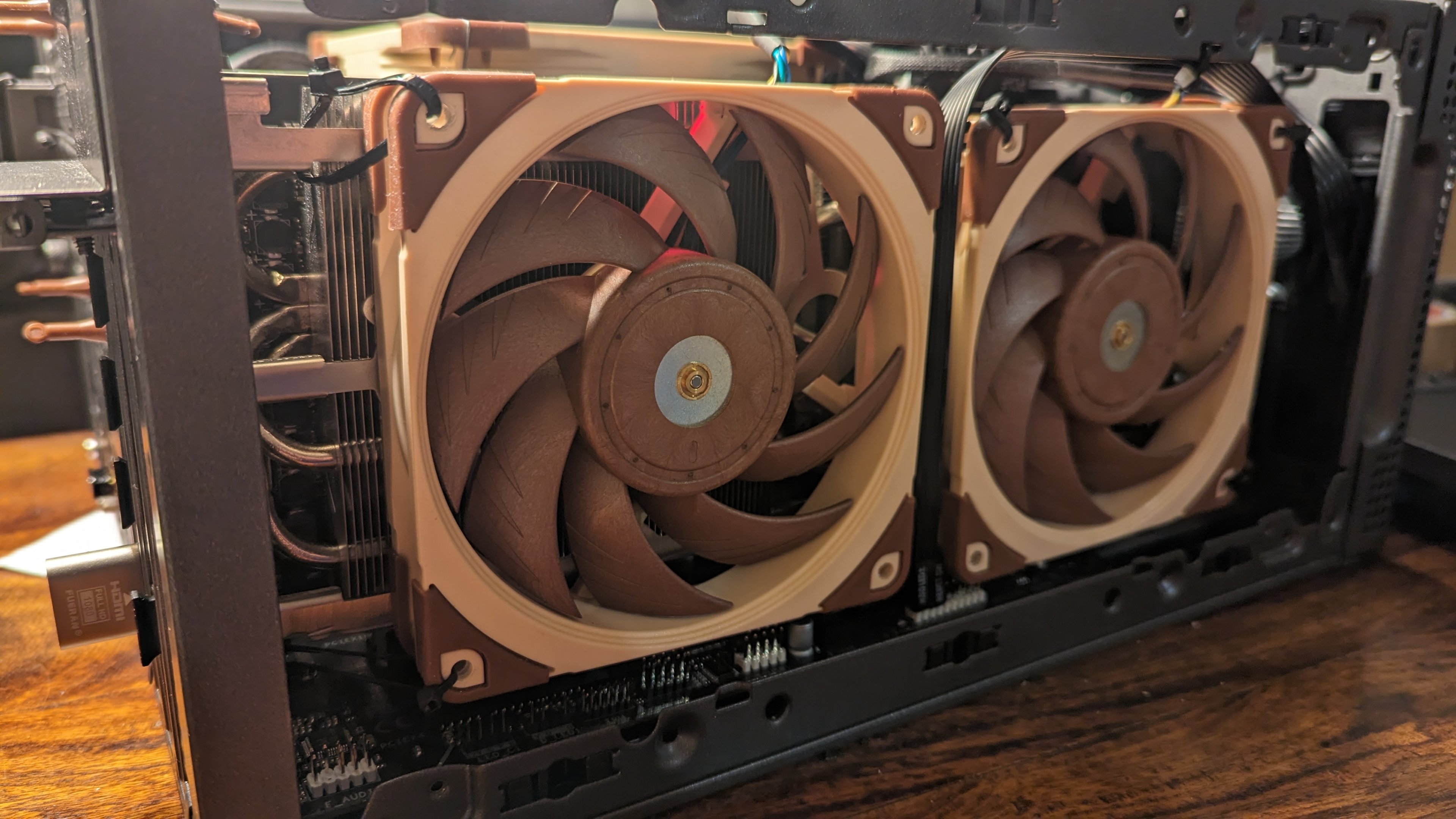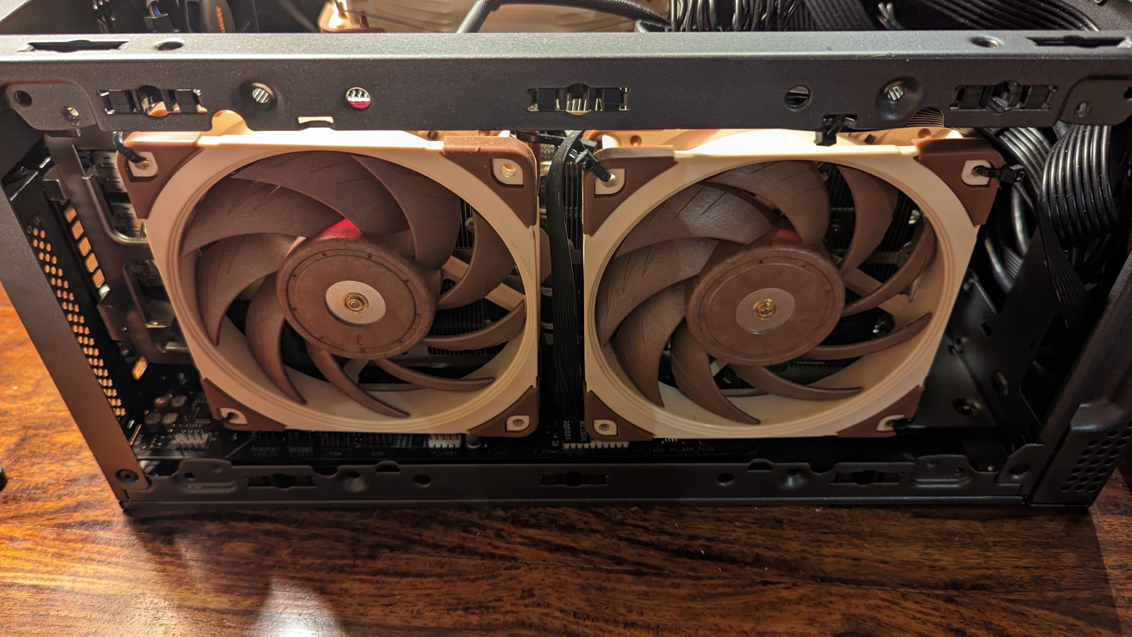 Auf dem Kühler habe ich dann zwei Noctua NF-A12x25 PWM (....aber ich bin Noctua-Fanboy) mit einem Haufen Kabelbindern fixiert. Die Ansteuerung der Lüfter erfolgt über die Grafikkarte. Im Idle mit aktivierter 0dB-Funktion, stehen die Lüfter auch still.